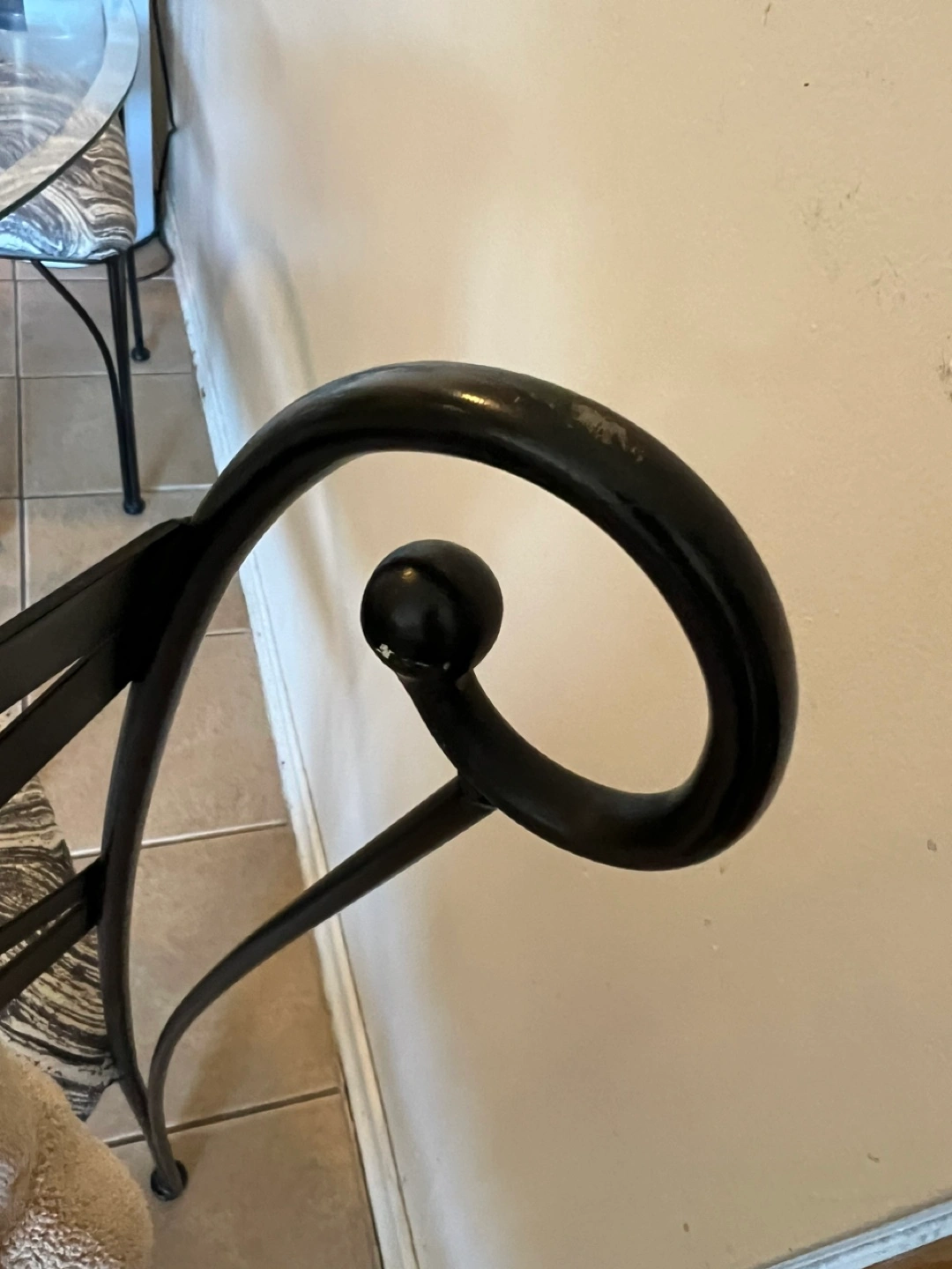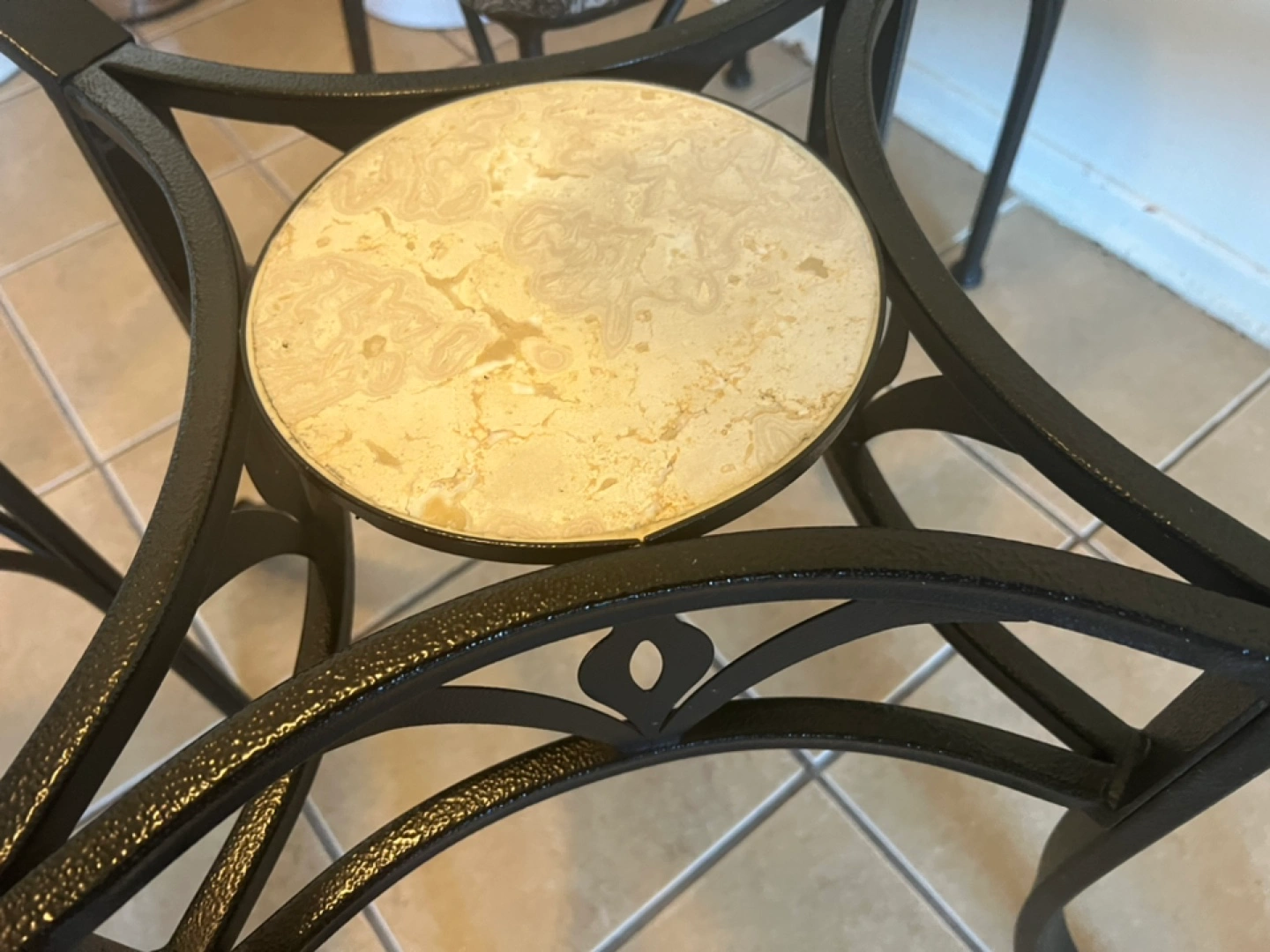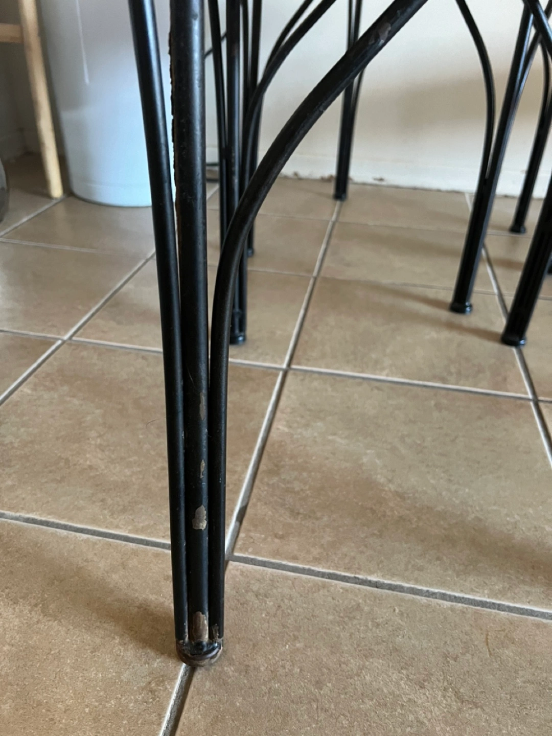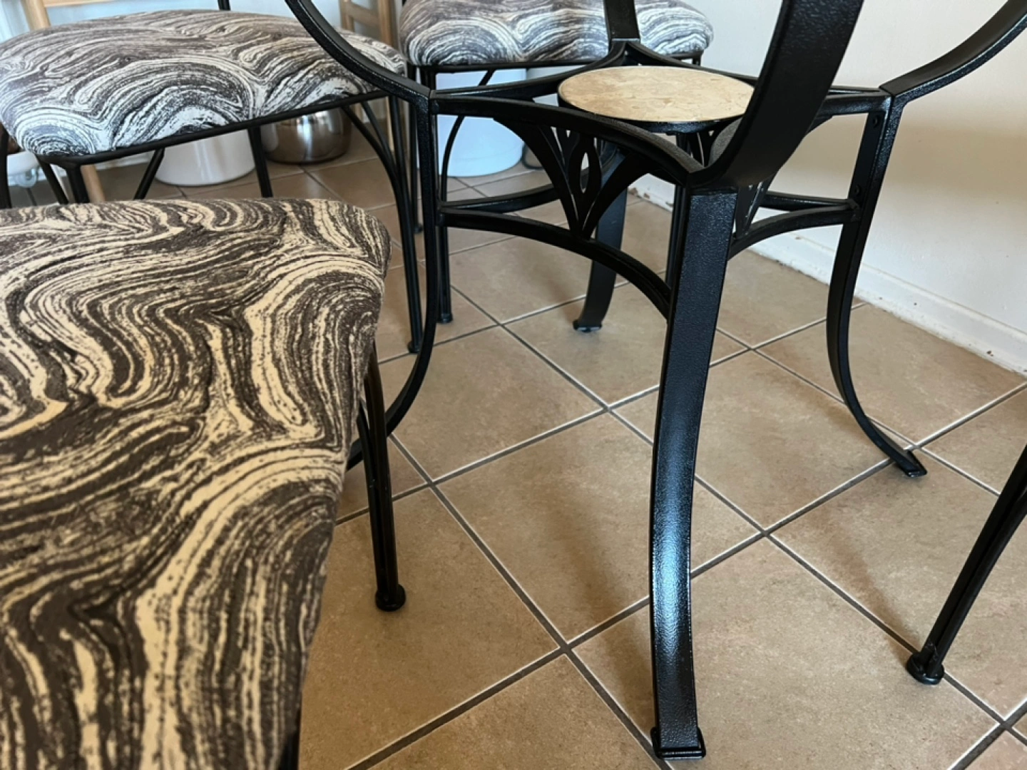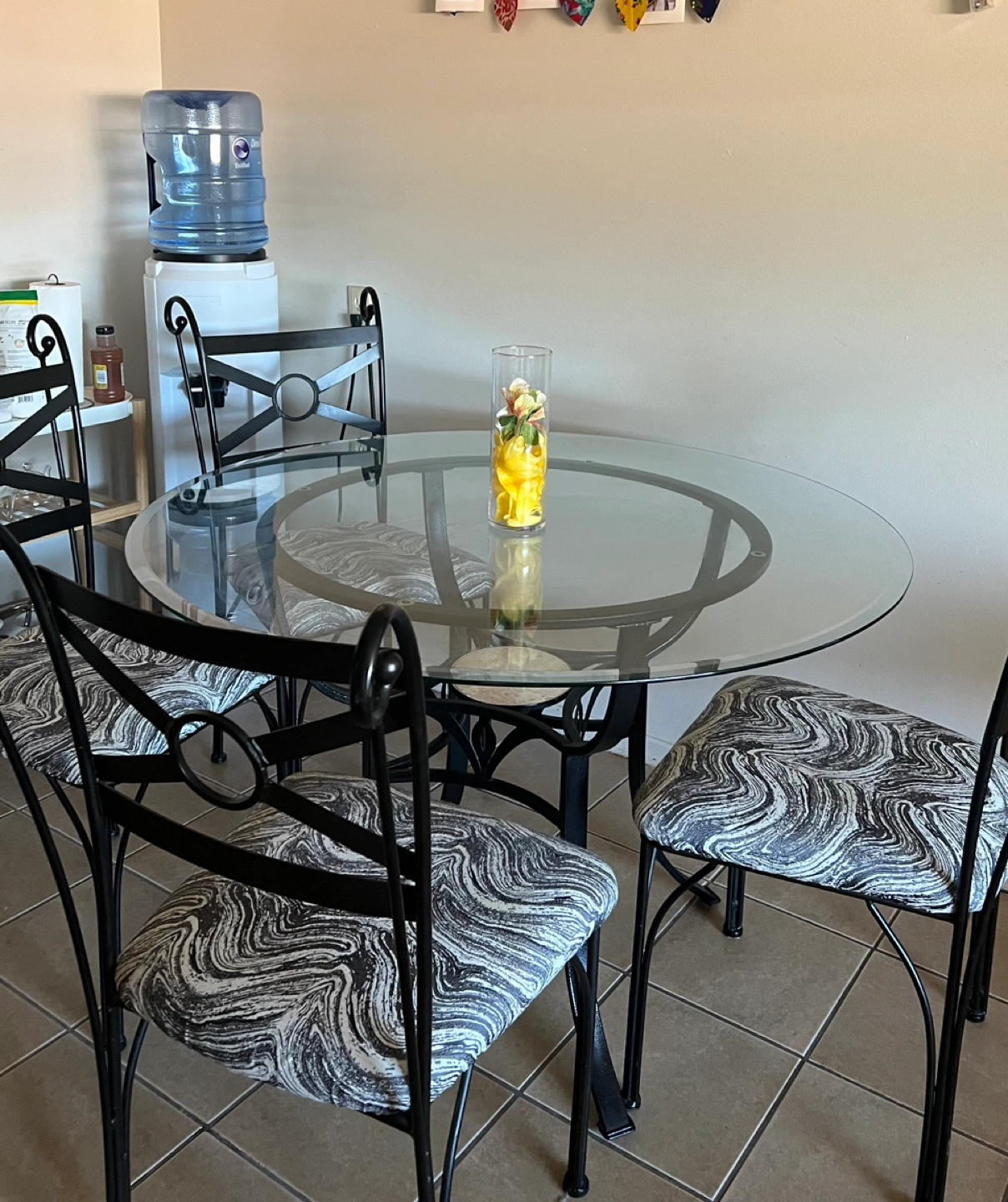 5Round glass table. Black metal frame. Four chairs included. Seats feature a grey and white swirl pattern. Minimalist style. Glass - 45” Height - 29.5” Wonderful Strong Dinning Table Set!(4 chairs included) They are strong since it is a metal frame and even 5 people can use (large glass) They have been taken care of well!(Pet free house) But there are some minor scratches/one rusted area of one of the chairs( check pictures ) Other than that, it is a mint condition! The glass is thick and strong and there is a marble underneath so it looks gorgeous! The price is firm and I am sorry I cannot deliver (moving needs a large car/truck : please measure your car trunk size before you come pick up! ) Please message me if you are interested! Thanks!