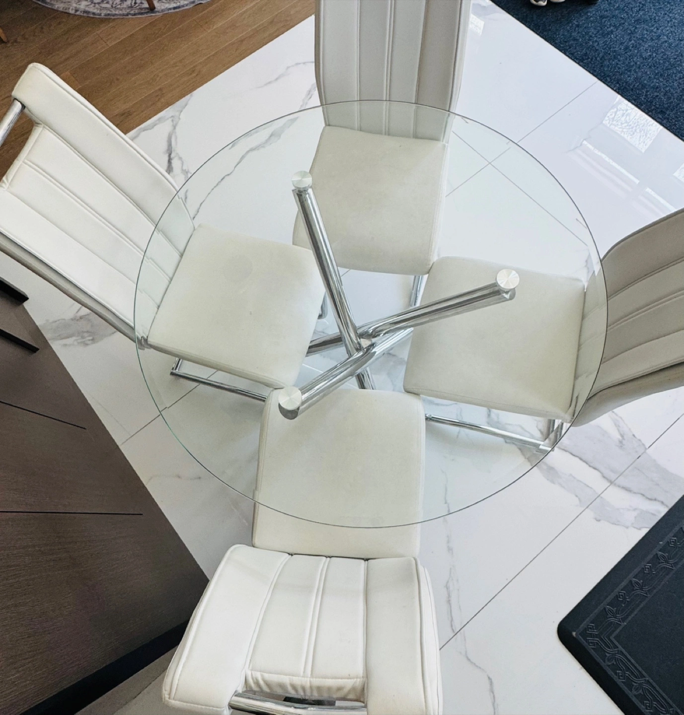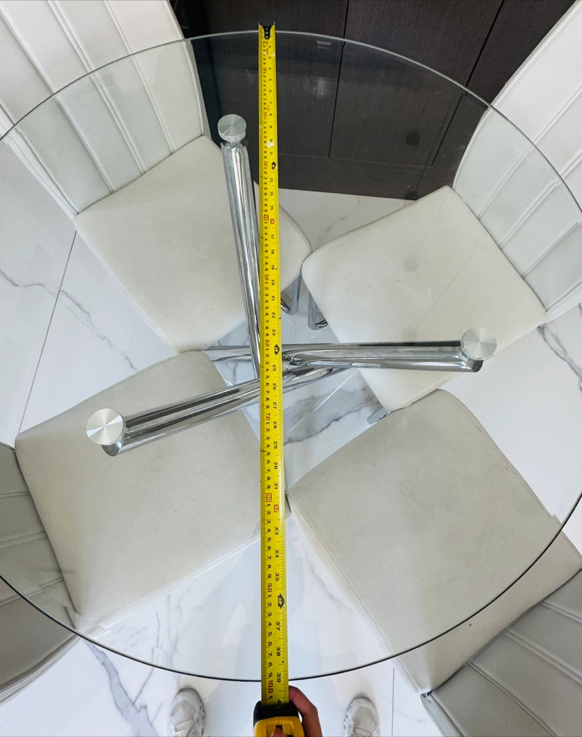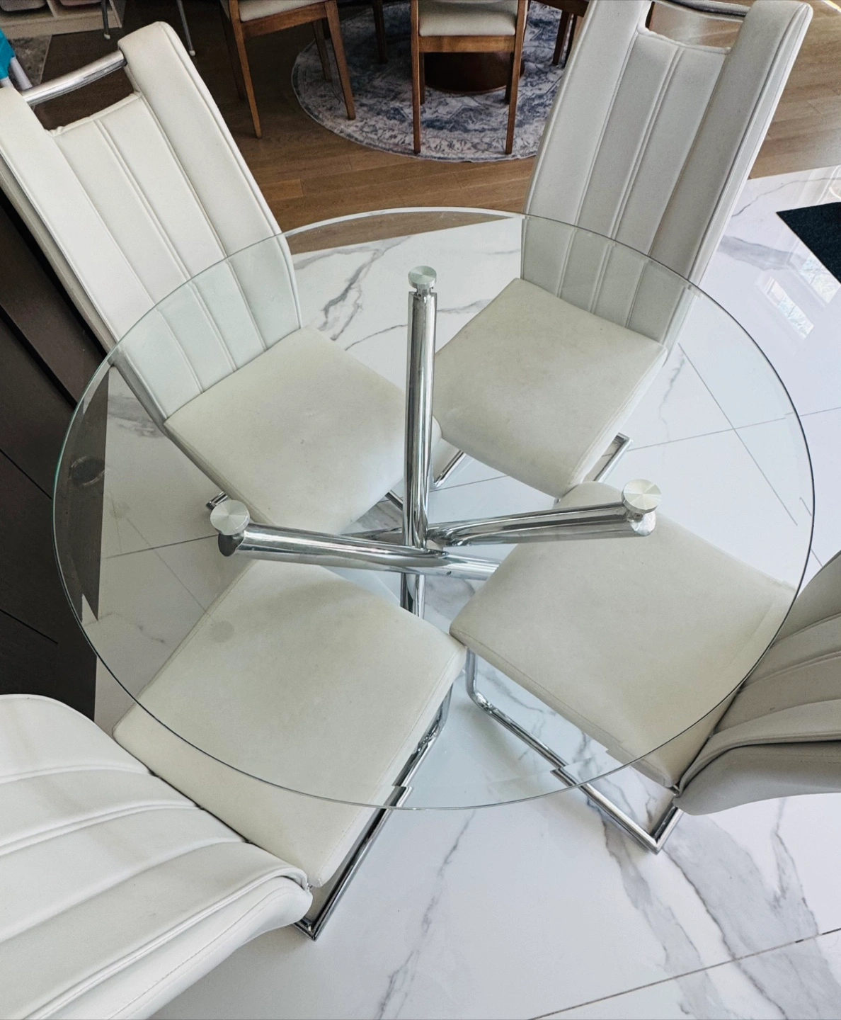 5Including the glass table and 4 chairs. Table size 40inch. Round glass tabletop. Chrome legs. Four white cushioned chairs. Minimalist design. Modern style. Good for small spaces.