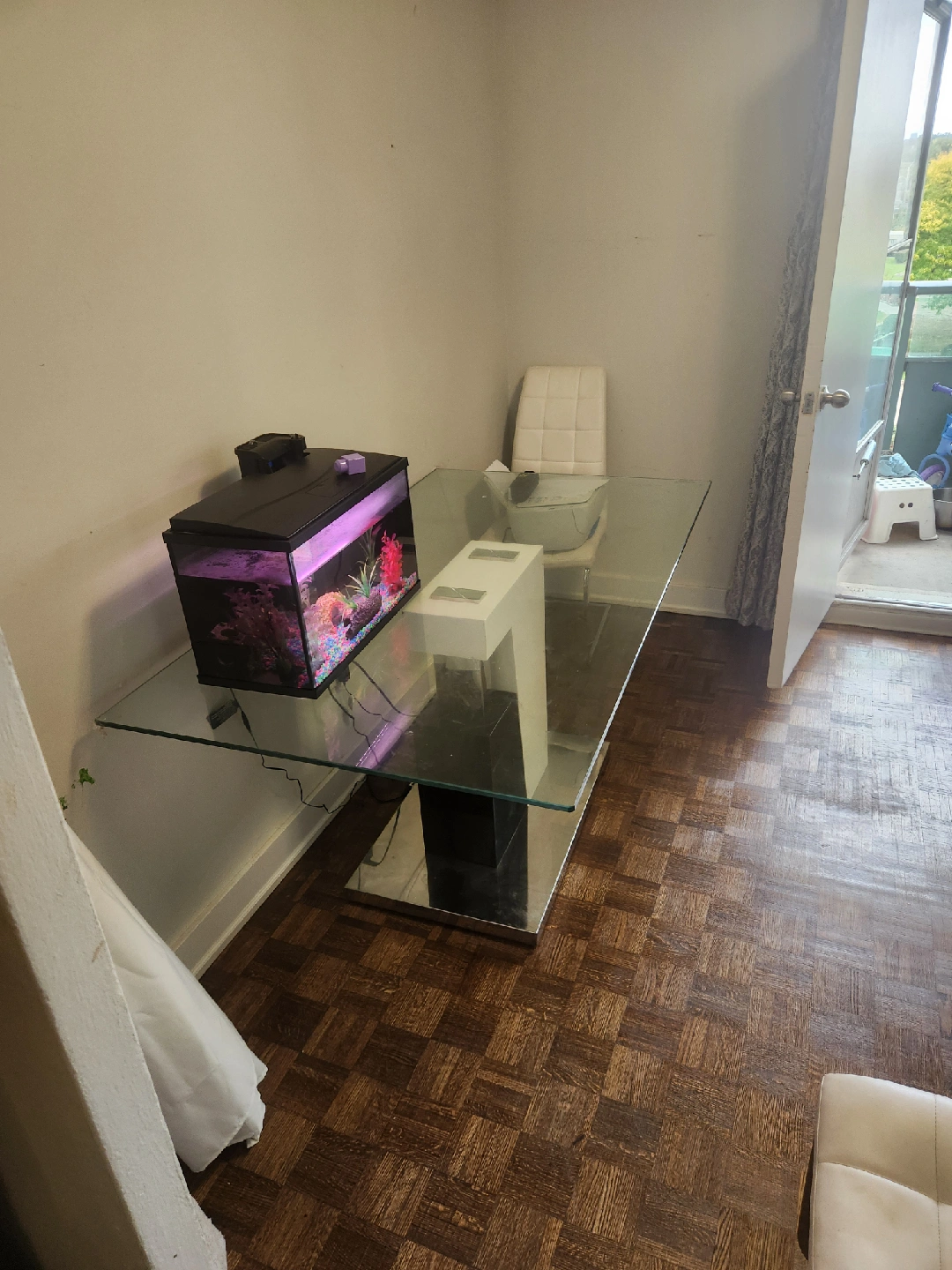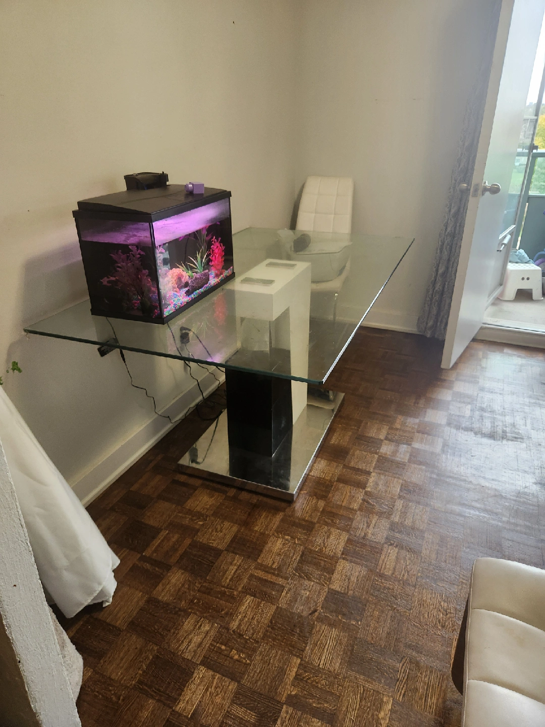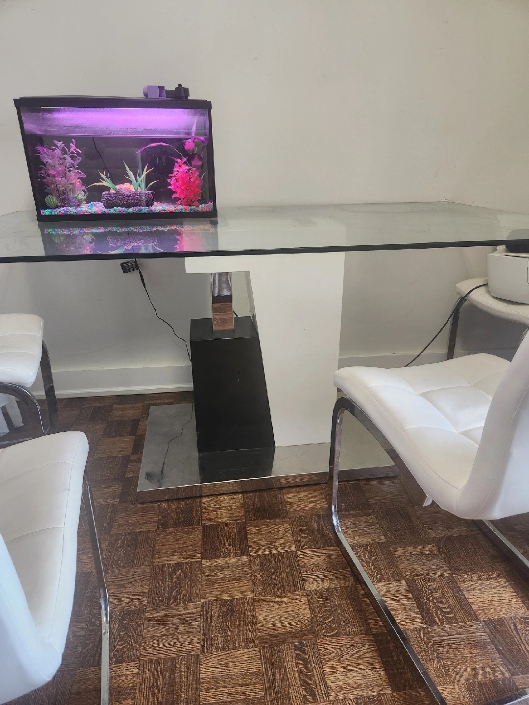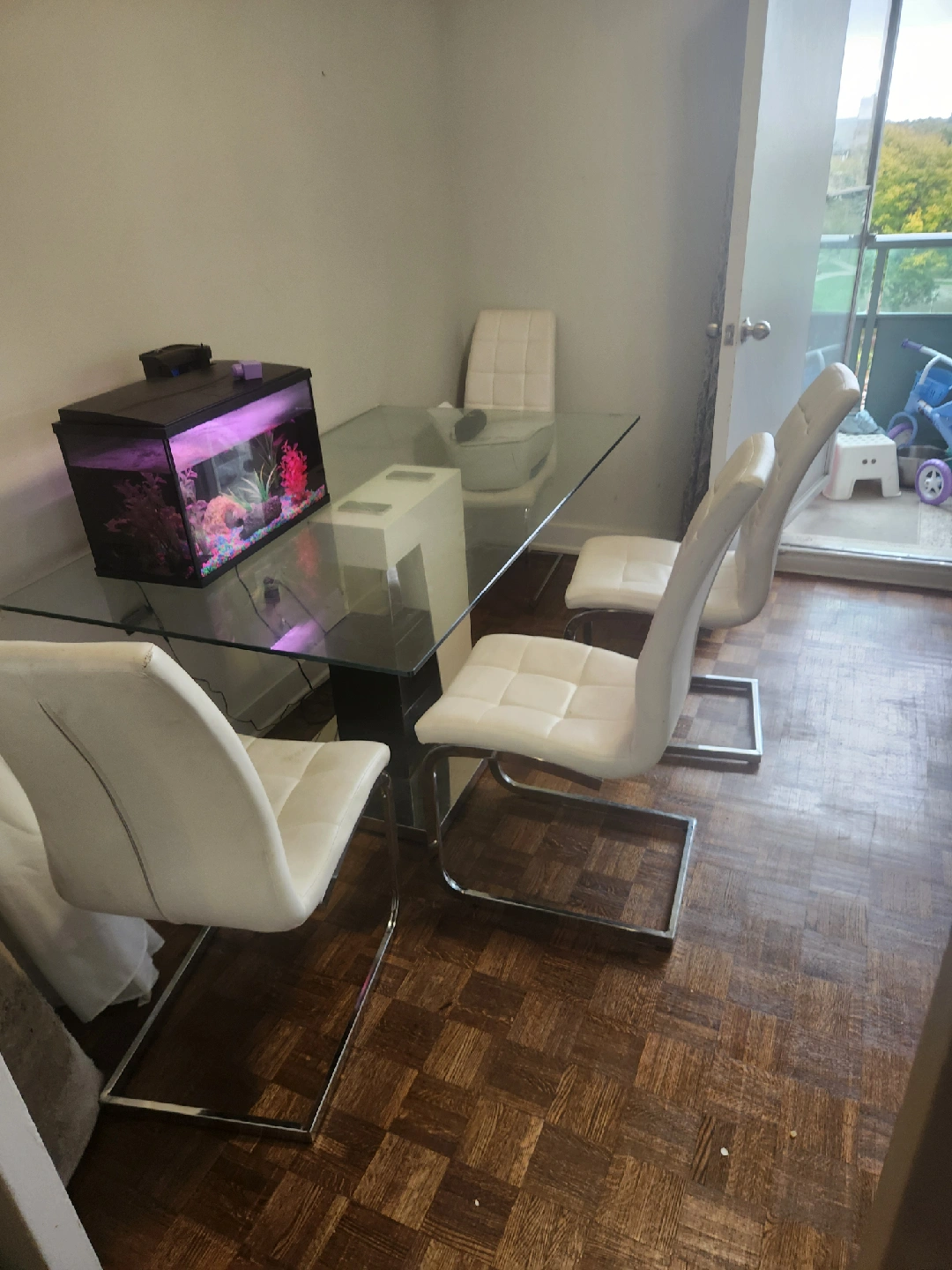 60Selling a stylish glass top dining table. It features a modern base with a black and silver accent. The table is in good condition and would be a great addition to any dining space