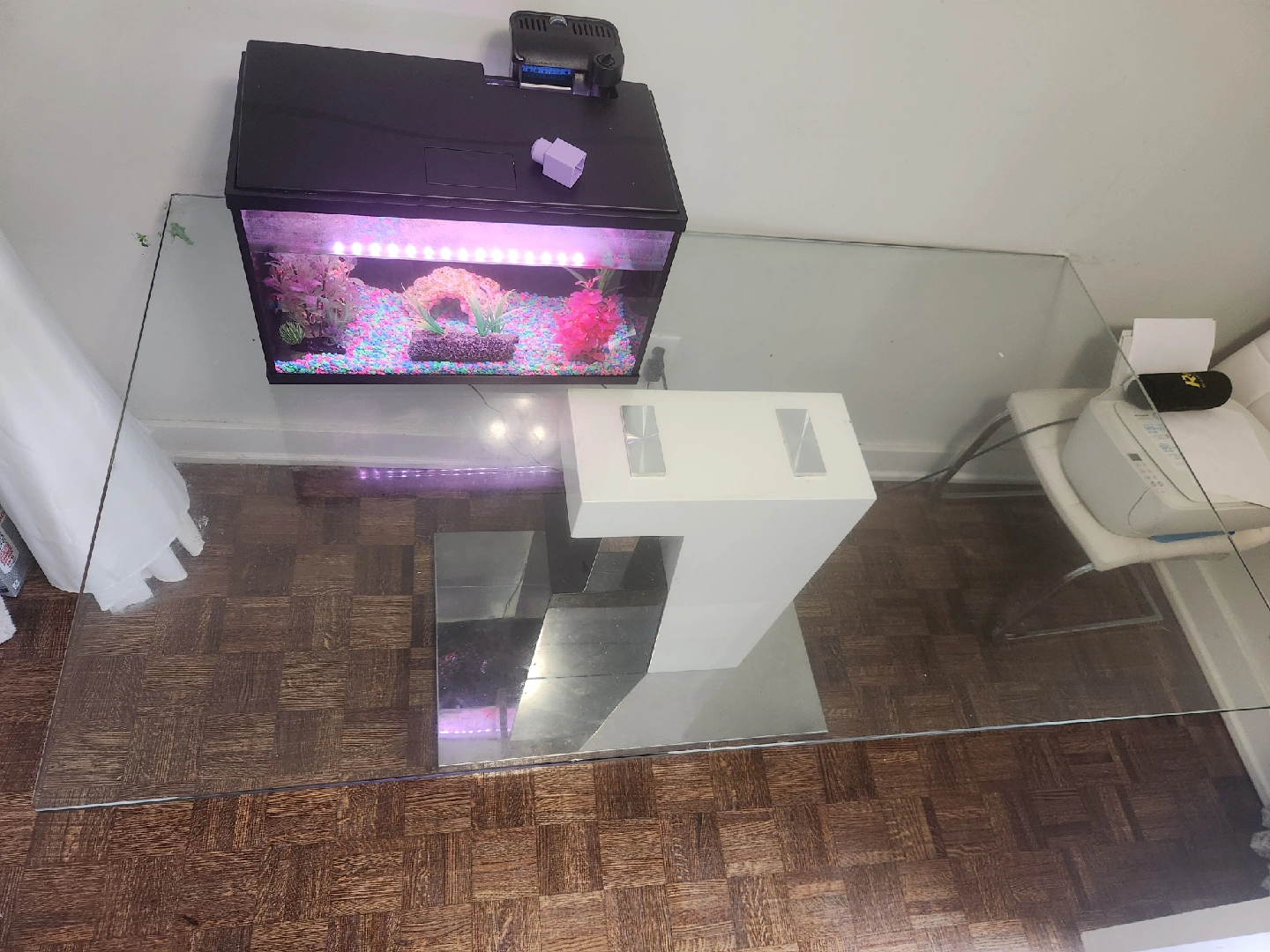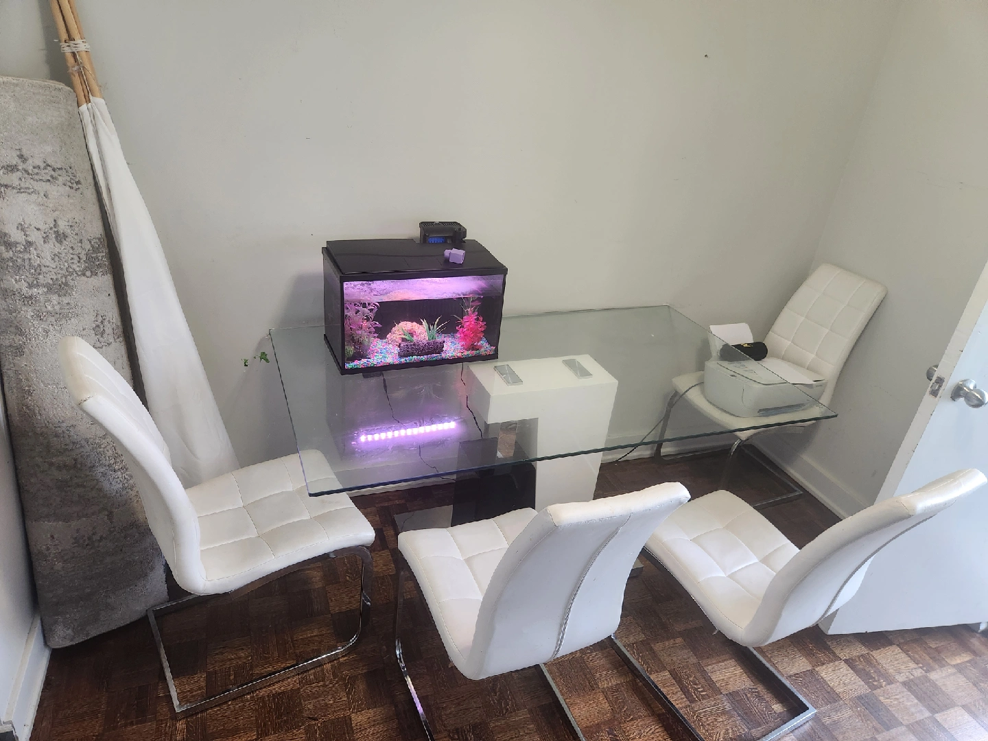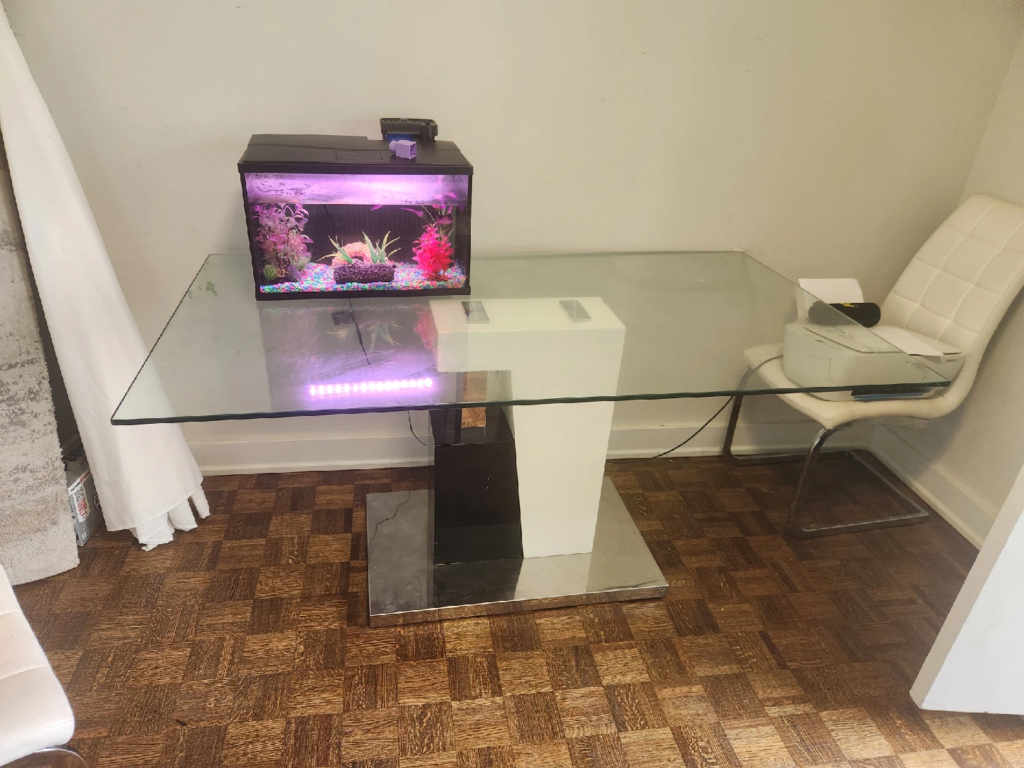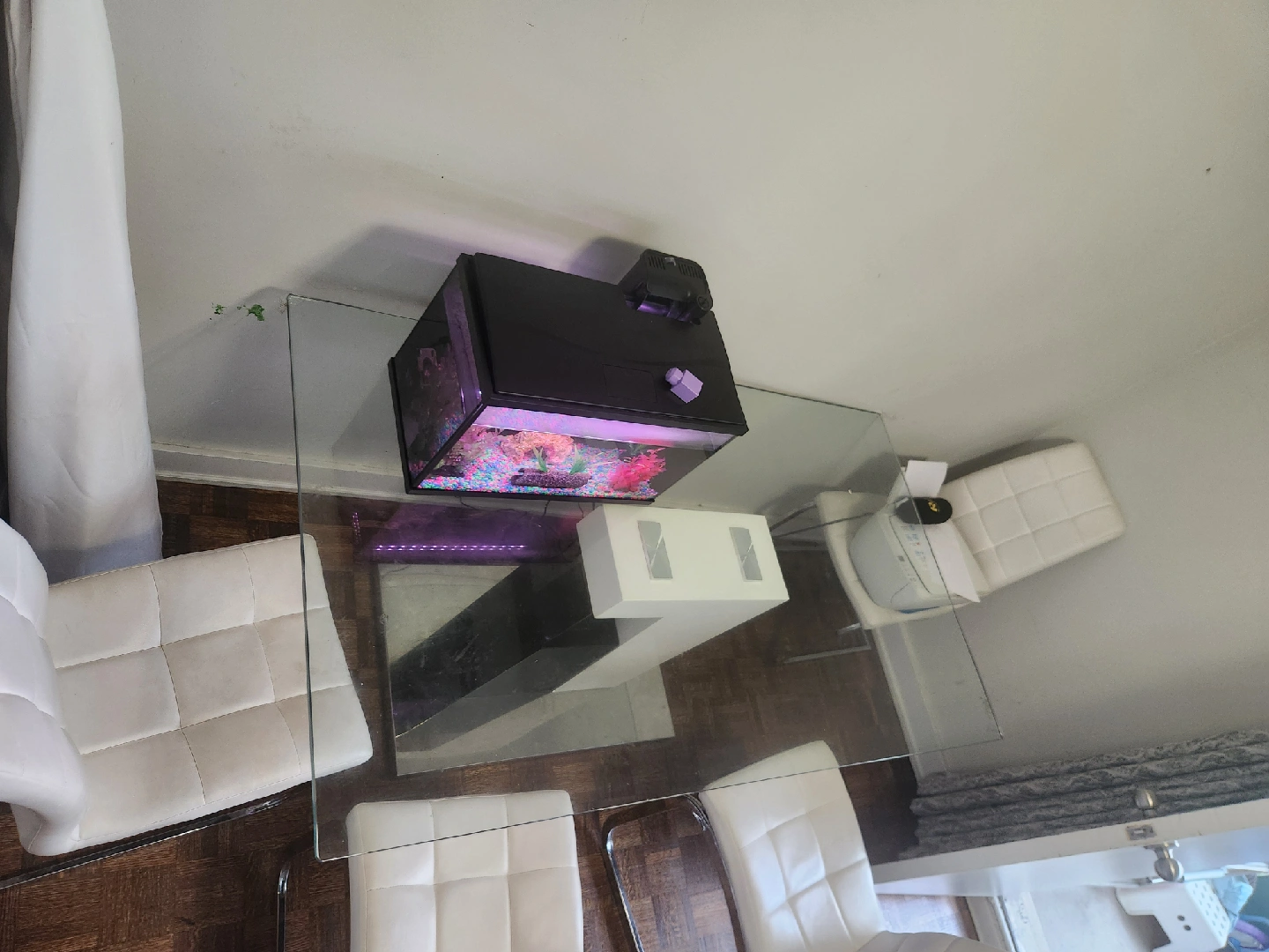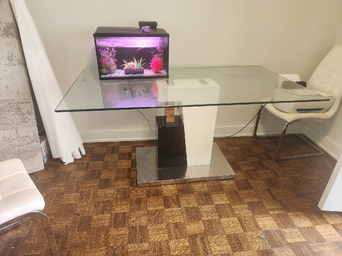 60Selling a stylish glass top dining table. It features a modern base with a black and silver accent. The table is in good condition and would be a great addition to any dining space