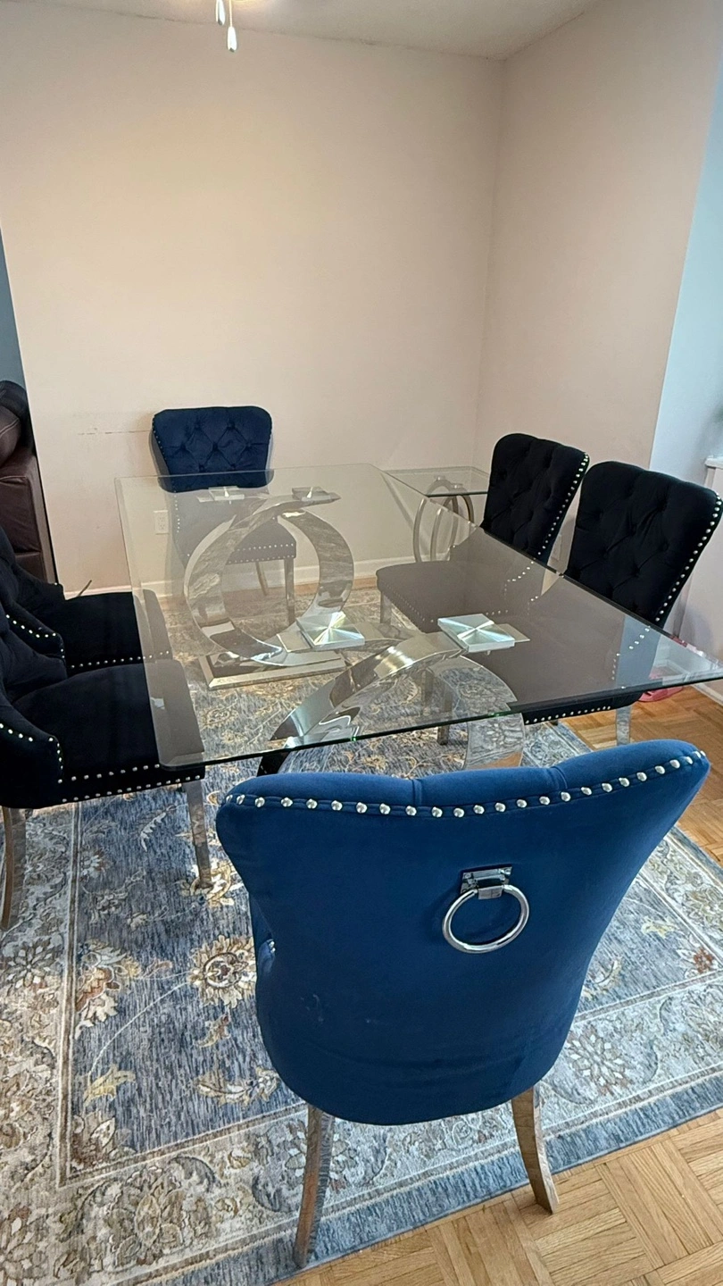 44Modern dining set. Features a large rectangular glass tabletop and a polished chrome base. Six upholstered chairs included, four dark blue velvet and two royal blue velvet. Elegant and stylish. No scratches used like now offer is acceptable