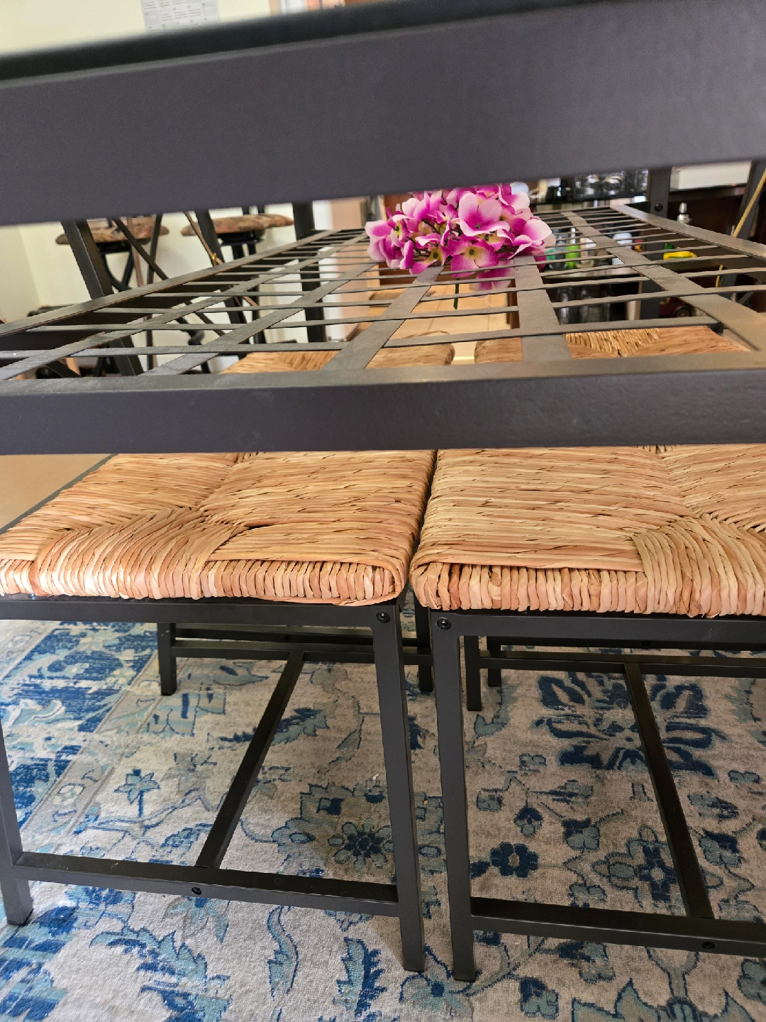 Selling a dining table with a glass top and woven chairs. The table has a unique design with a metal frame and a woven base underneath the glass. It comes with matching woven chairs. Perfect for a dining room or kitchen space!
