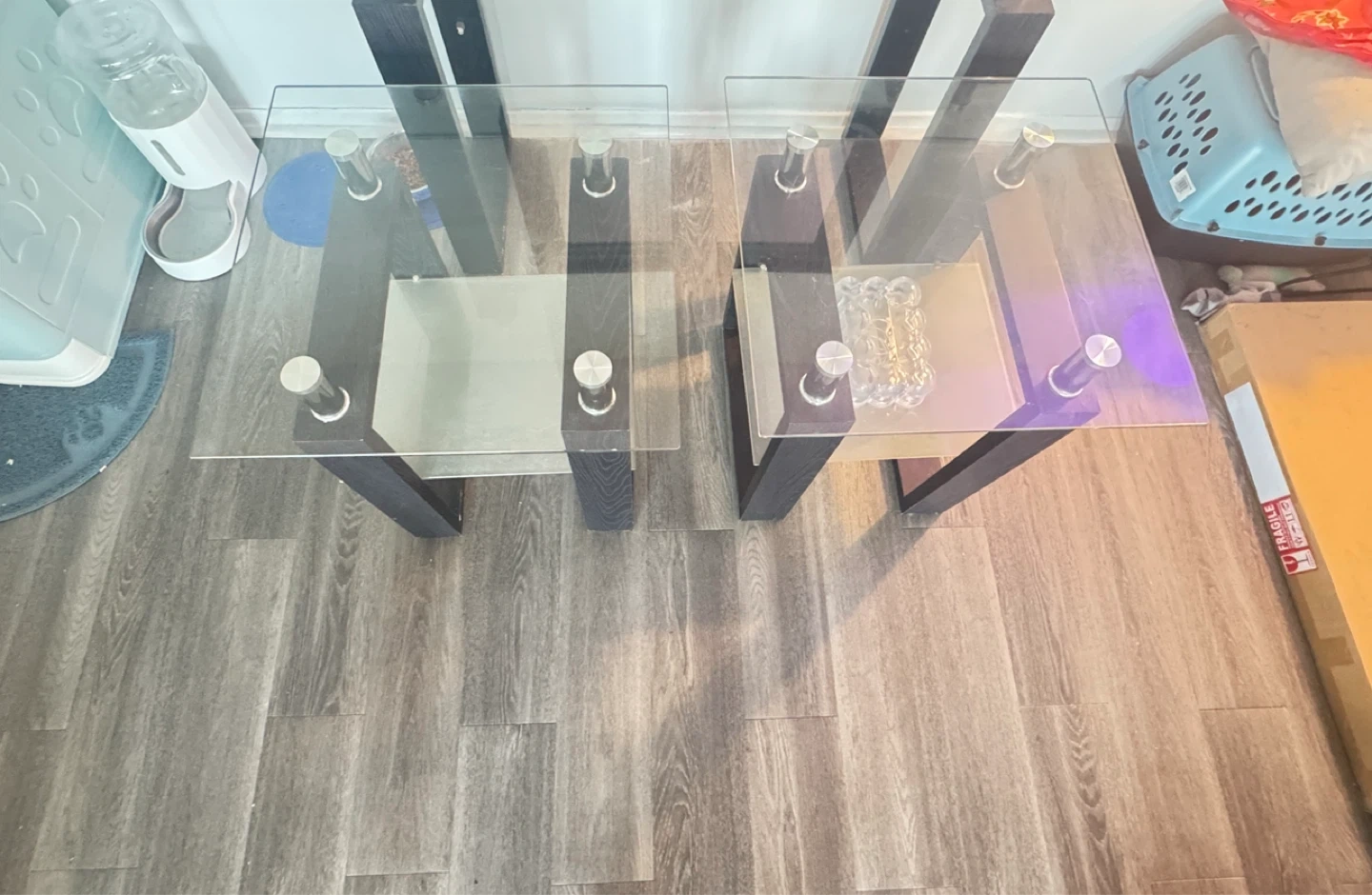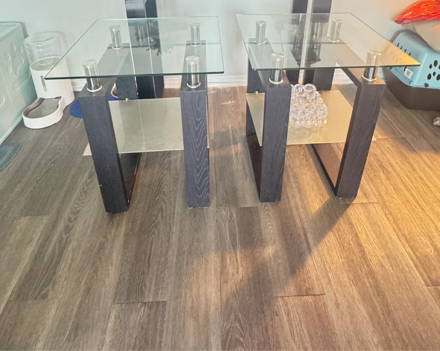 Condition: 4.5 /5 ( Well maintained and has a few minor wood chips) Selling a pair of glass top end tables. They have a modern look with a black wood-like frame and a clear glass top. There's also a lower shelf for extra storage or display. Perfect for adding a touch of elegance to your living room or bedroom. Pick up near Oxford Street West