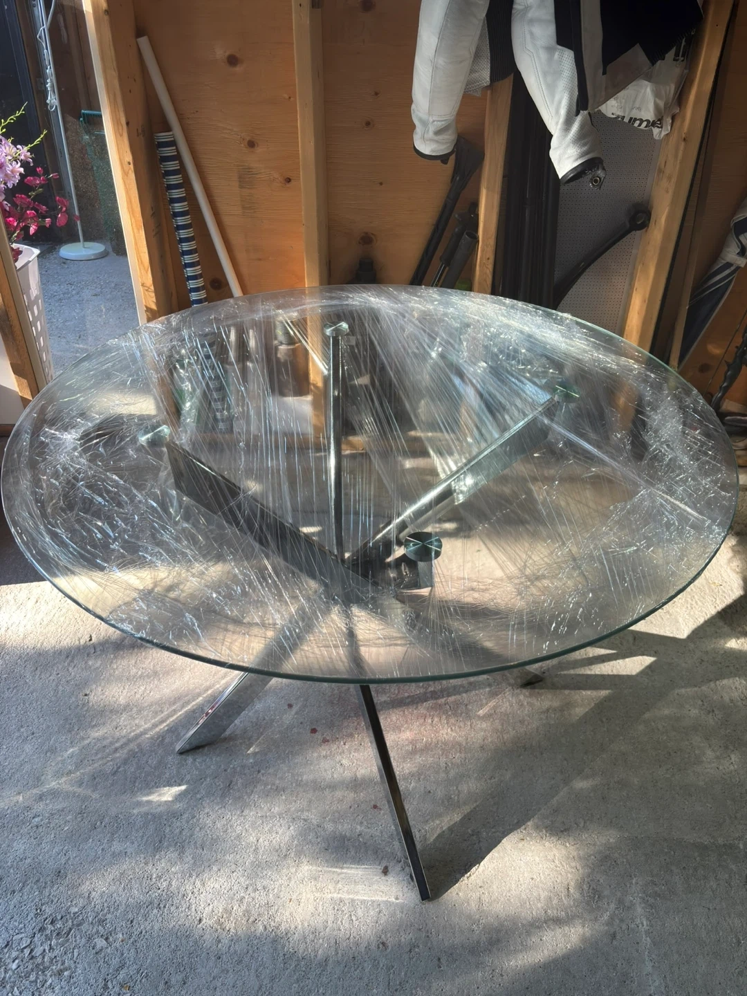 Selling a modern round dining table with a glass top and four chairs. The chairs are white and have a sleek design with wooden legs. The table features a chrome base, adding a touch of elegance to any dining space. Perfect for small to medium-sized dining