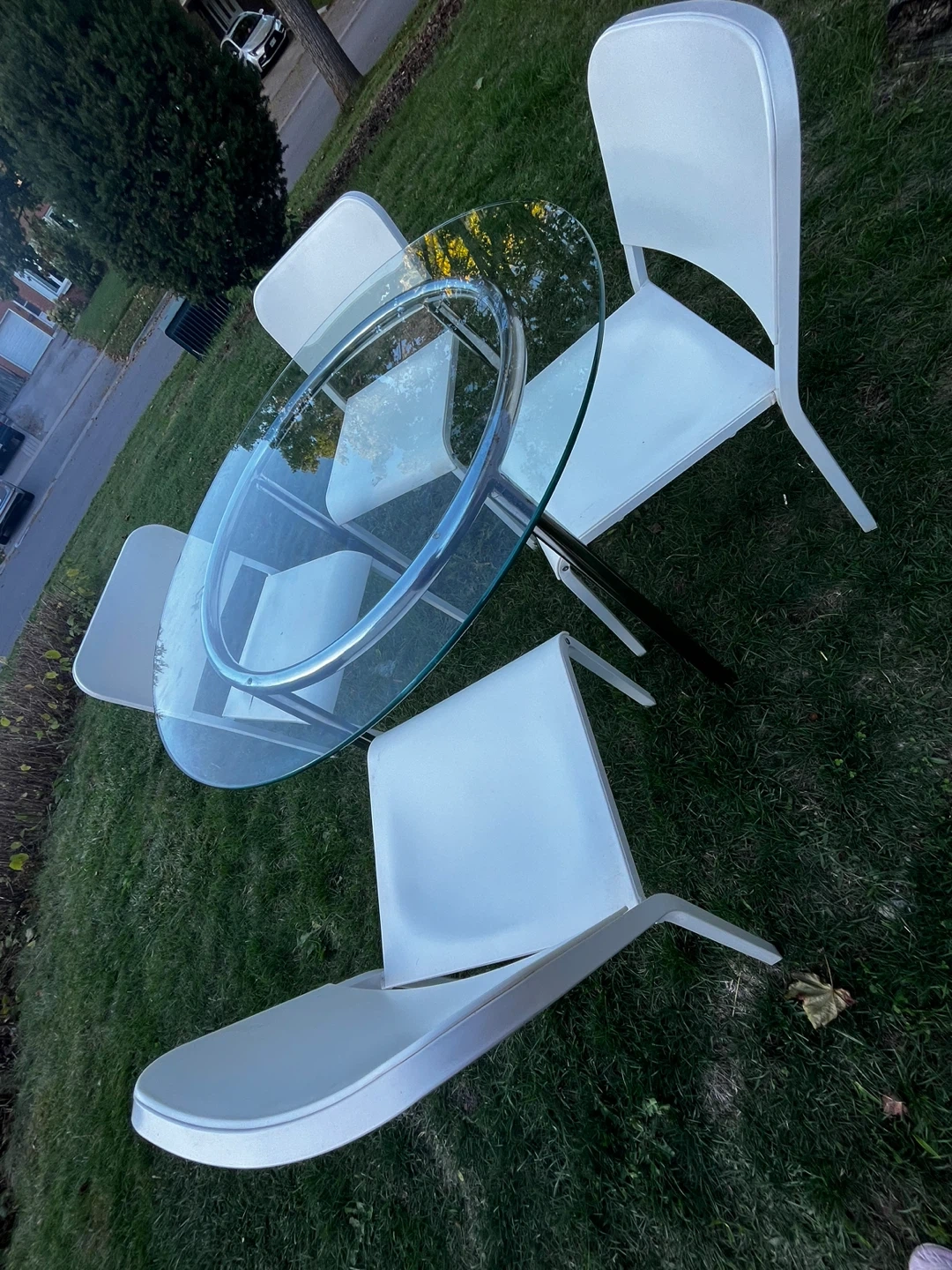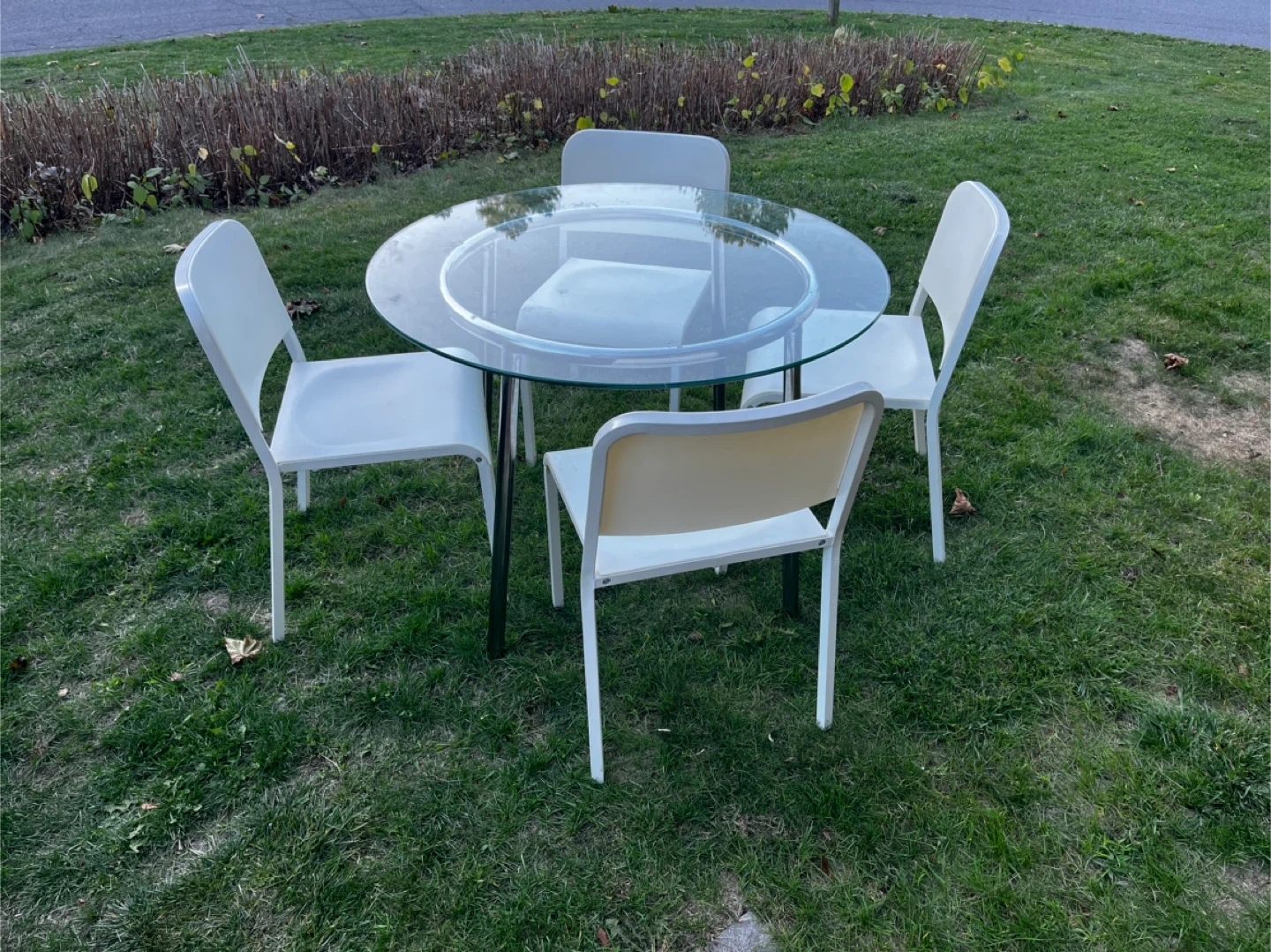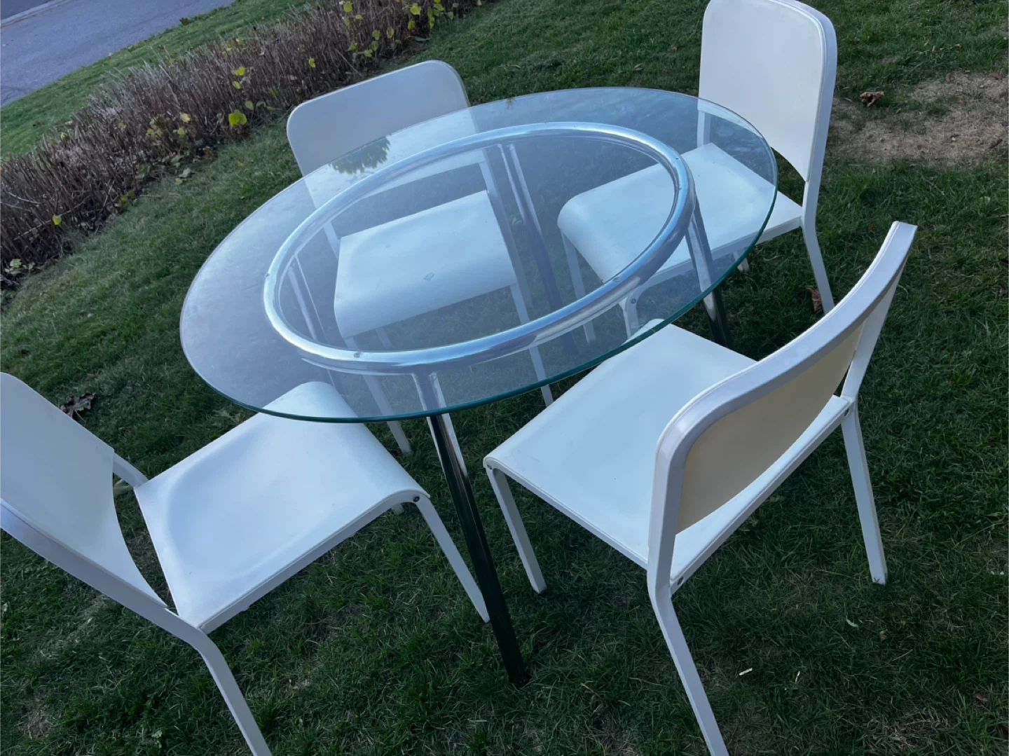 10Here's a lovely glass-top round dining table that comes with four white chairs. It's perfect for a small dining area or kitchen nook. The chairs are a clean white and complement the sleek glass top nicely. It's a great set for enjoying meals with family or friends! Comes with 6 table mats and 4 chair cushions.