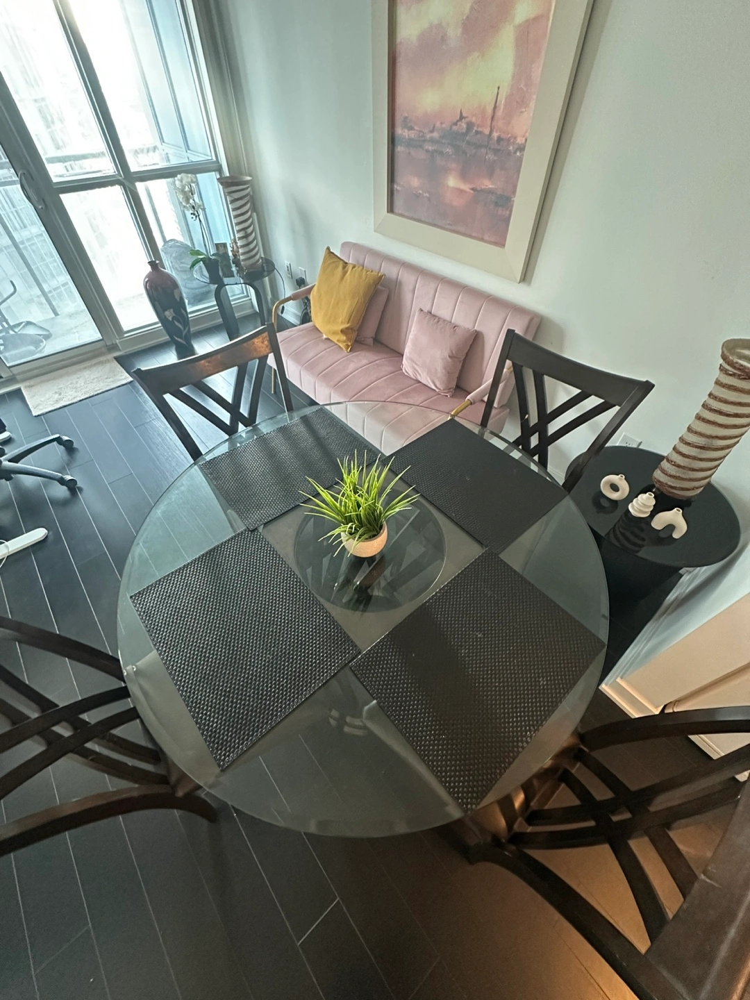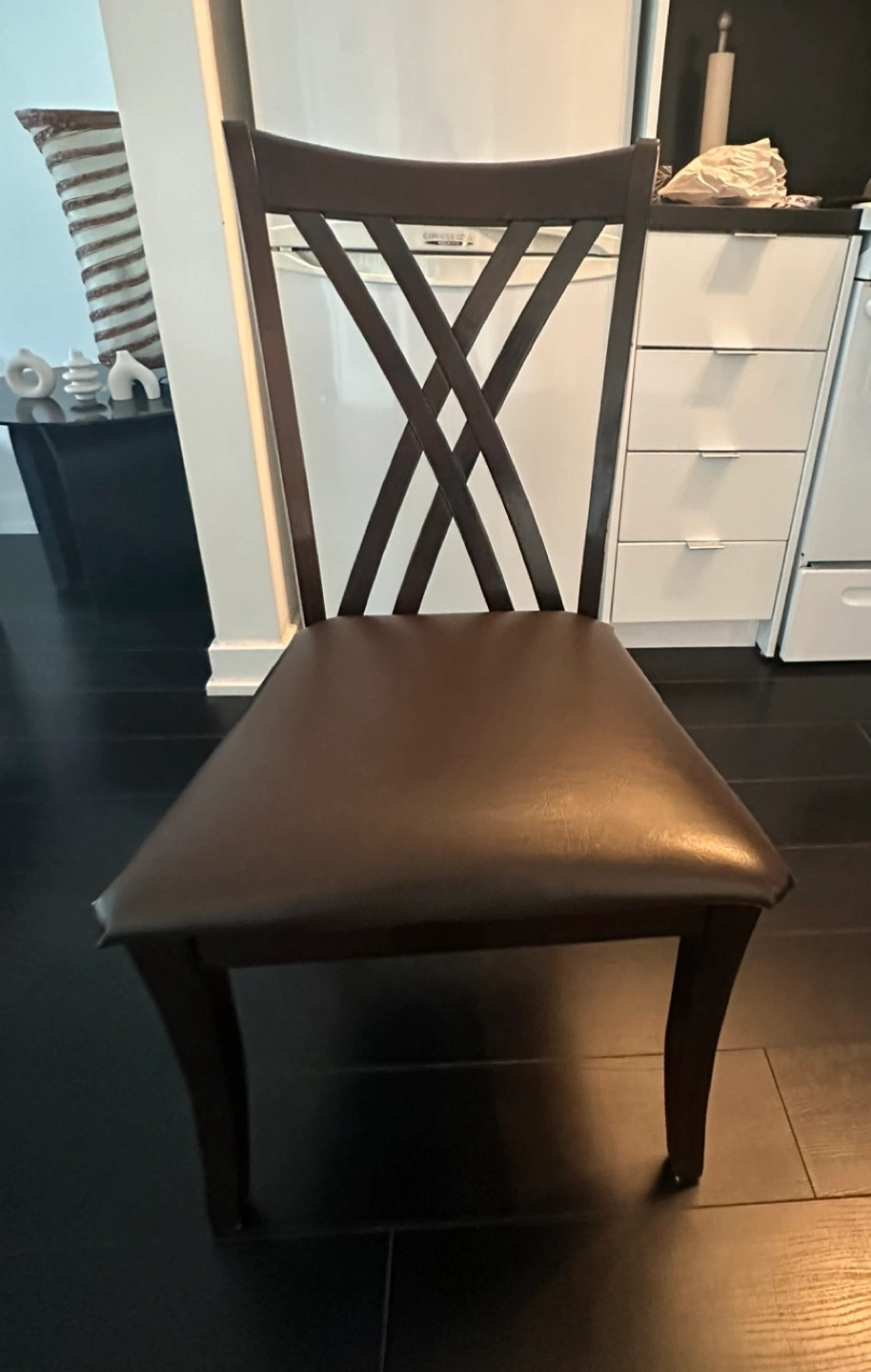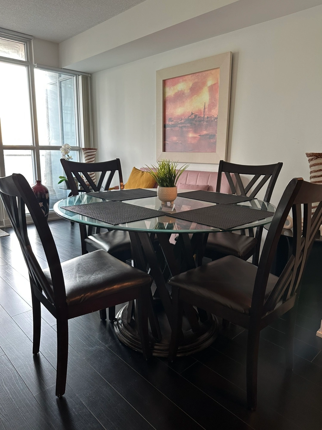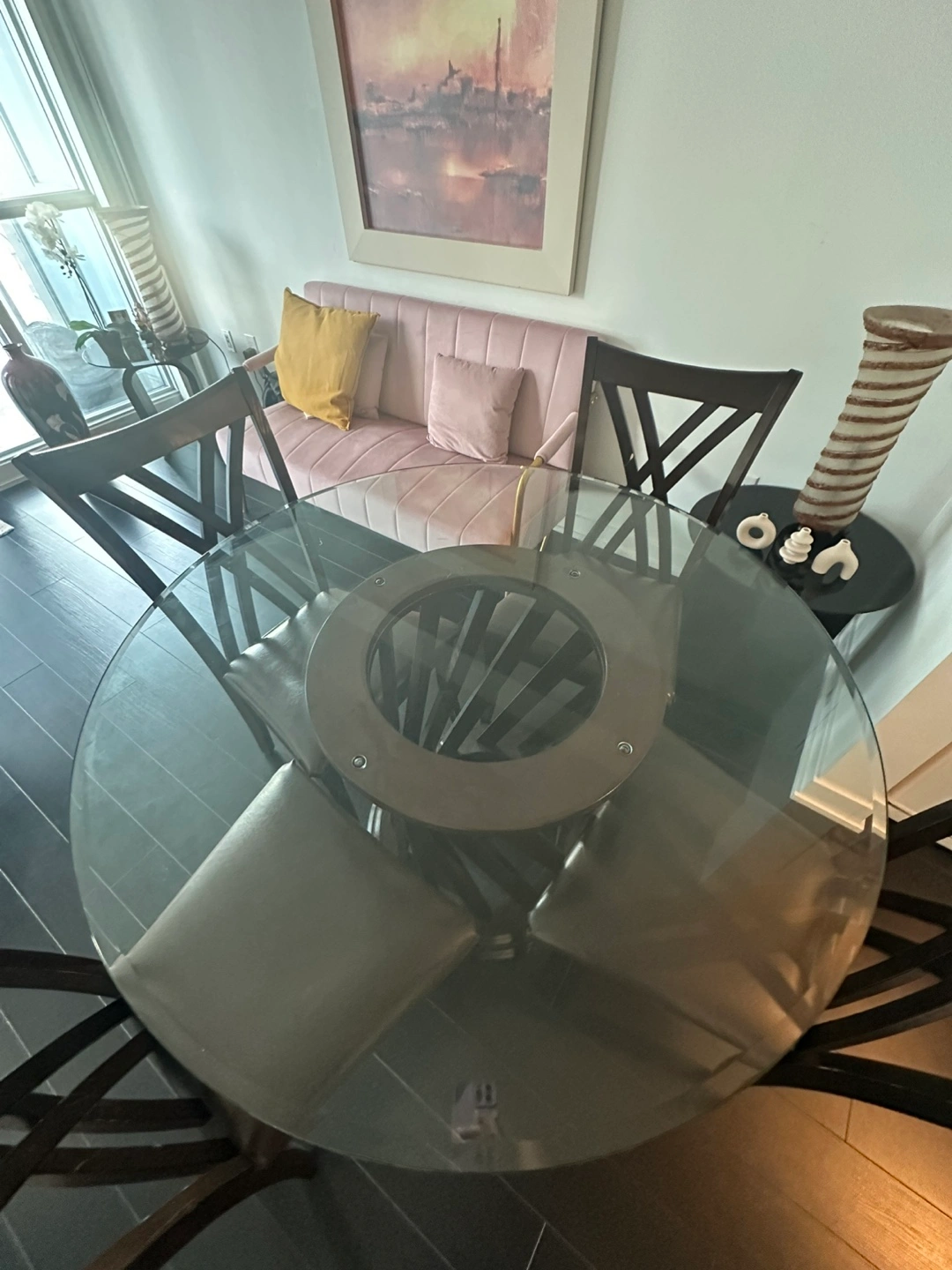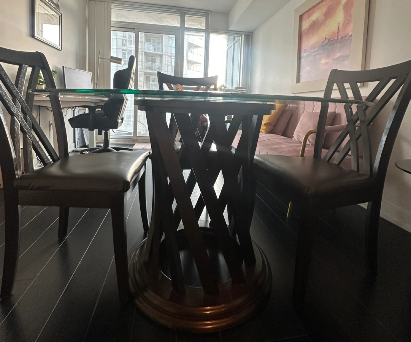 78Round glass-top dining table. Dark brown wooden base and four matching chairs with leather seat covers. In great condition! Perfect for small spaces in your kitchen or dining room. Dimensions: Diameter of glass top = 48 inches Height = 29.5 inches Please note: buyer will be responsible to pickup the item from the seller.