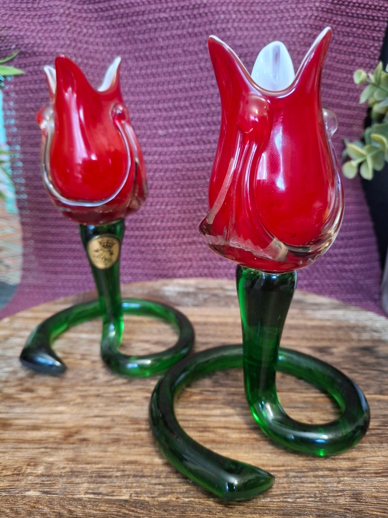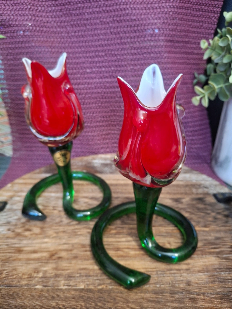 Add a touch of elegance to your home with these beautiful glass tulip candle holders! The red tulip blooms and green stems create a stunning visual. They're in great condition and ready to brighten up any space