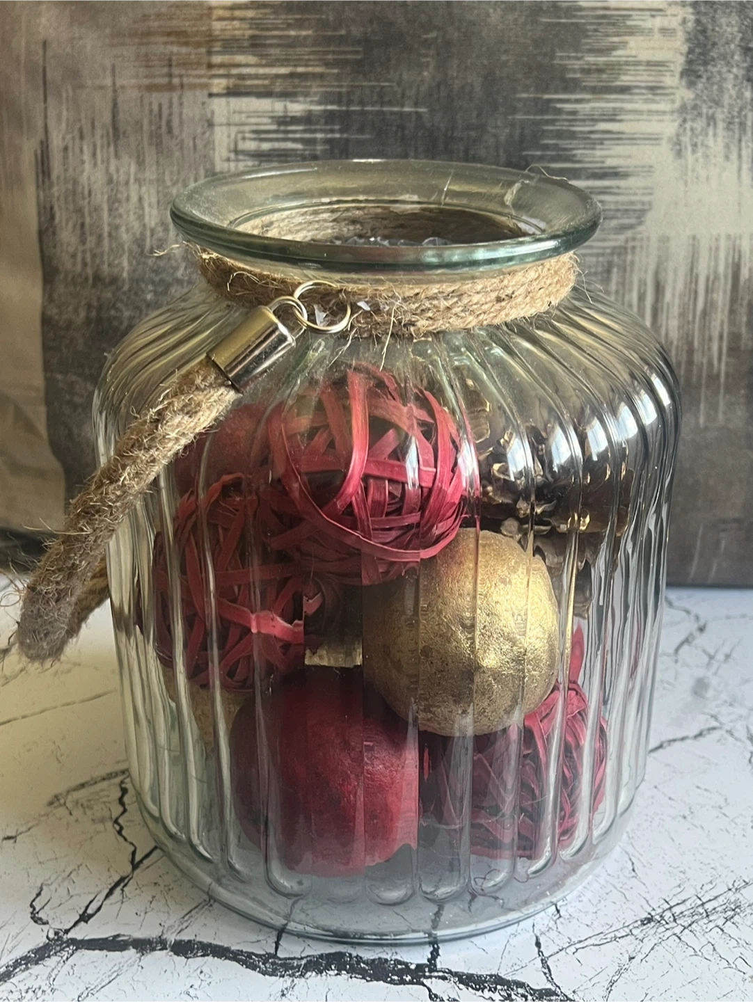 Selling a lovely glass vase filled with decorative balls! It's in great condition and would look great as a centrepiece or on a shelf. The vase has a ribbed design and a rustic rope accent. The decorative balls inside are a mix of red and gold colours, adding a touch of warmth to any room