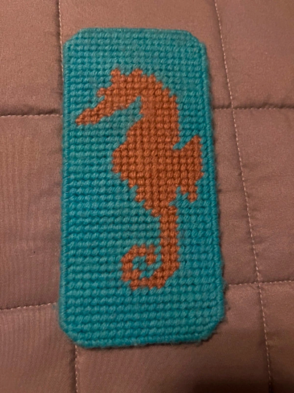Glasses case for sale. Light brown seahorse on an aqua blue-green background. About 6.5x3”. Great for protecting eyeglasses or sunglasses in a purse, bag, drawer, and more. $6. Near the Burlington/Oakville border. No delivery.