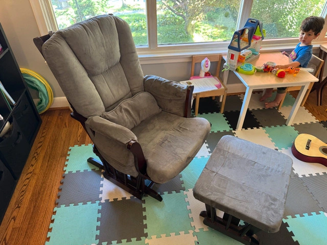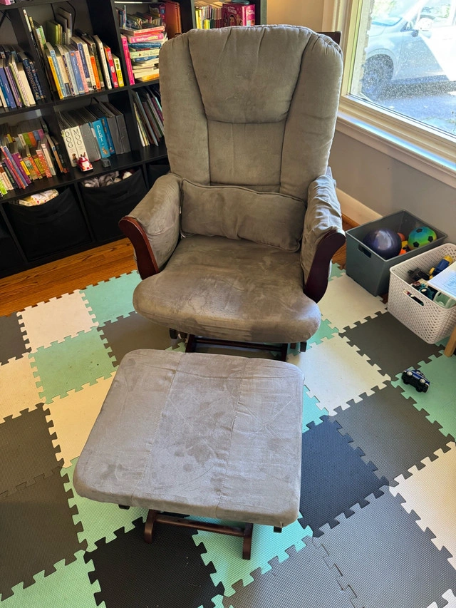 Glider chair and ottoman set used for baby nursery. Grey upholstery and walnut frame. Condition: Used - Good For Sale By: Owner