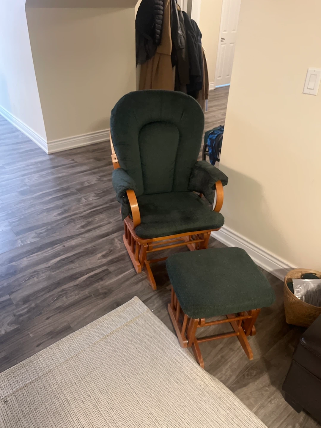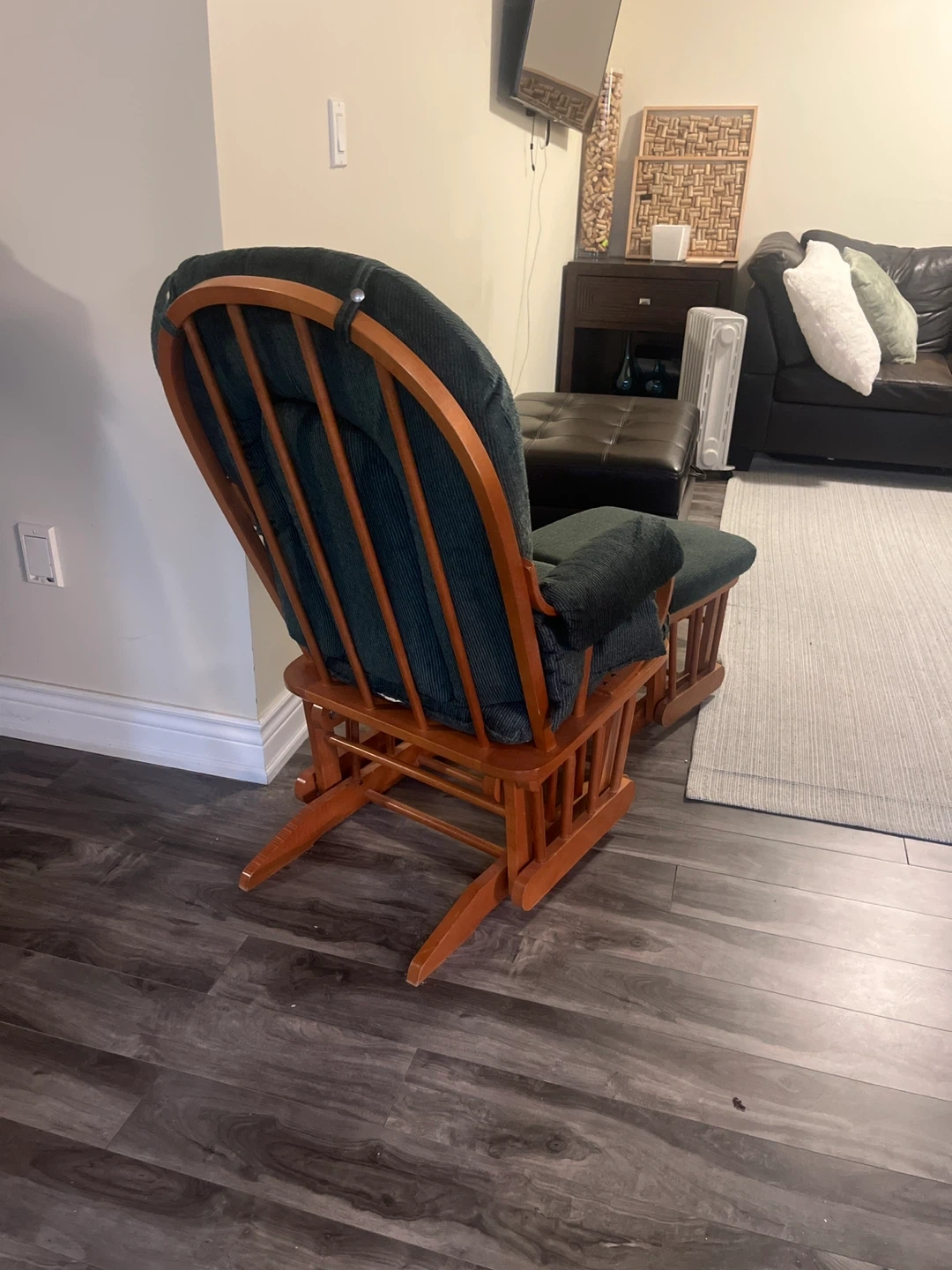 Selling a comfy glider rocking chair with a matching ottoman. It's perfect for relaxing and unwinding after a long day. The chair is in great shape and has a smooth gliding motion. The cushions are a nice dark green colour. Would be great for a nursery!