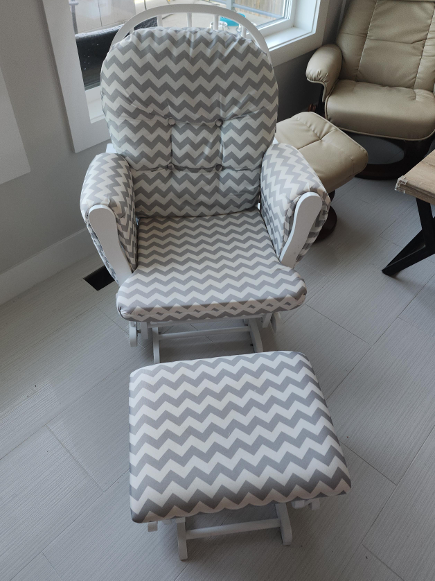 Cozy gliding rocking chair with matching ottoman! Perfect for a nursery or any room where you want to relax. The chair and ottoman have a stylish grey and white chevron pattern. Gently used and in great condition!