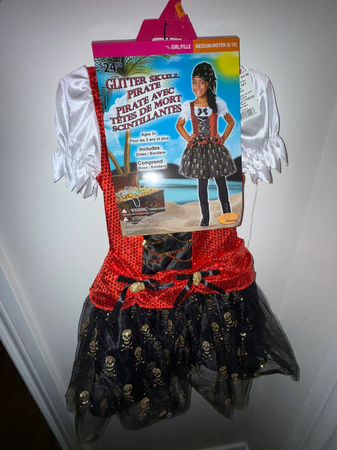 106Ahoy there! I'm selling a Glitter Skull Pirate costume for girls, size medium (8-10). It includes the dress and bandana. Perfect for Halloween or dress-up!