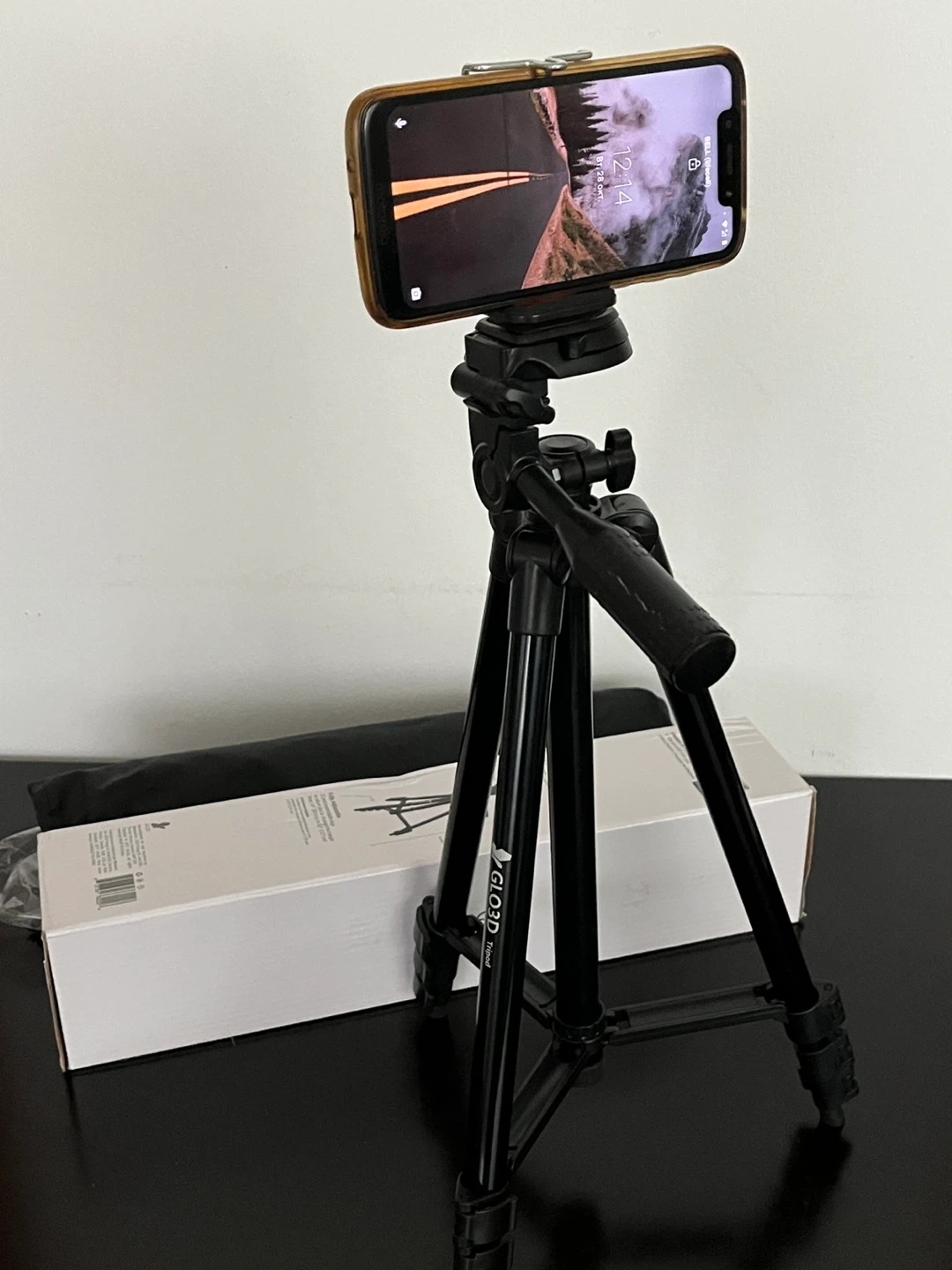 1000+GLO3D phone holder tripod. It fits the vast majority of smartphones. The tripod is fully adjustable with 3 level extendable legs to allow you to change the height from 14" (35 cm) to 50" (127 cm). Comes with the original box and carrying bag.