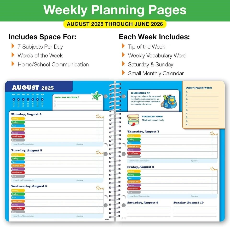 8.5" x 11" Student Agenda & Academic Planner for elementary school students. Planner runs from August 2025 through June 2026 BONUS Bookmark / Ruler and Planning Stickers Dated weekly format calendar pages for jotting down assignments BLOCK format for individual subjects and monthly calendars for important dates.