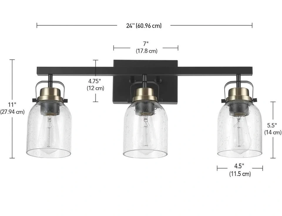 108Upgrade your bathroom or vanity space with this elegant 3-light Globe Electric fixture. Perfect for makeup lighting or modern interiors. Features: • Matte Black finish with Matte Brass accent sockets ✨ • 3 x Seeded Glass Shades • Uses standard E26 bulbs (not included) • Suitable for bathroom, vanity, or beauty room lighting Condition: 🆕 Brand new — box has minor cosmetic wear, light itself never installed, perfect condition. 📦 Includes all original parts and packaging. 💰 Price: $ 75 CAD (original Amazon price $119 CAD) 📍 Location: Riverbend