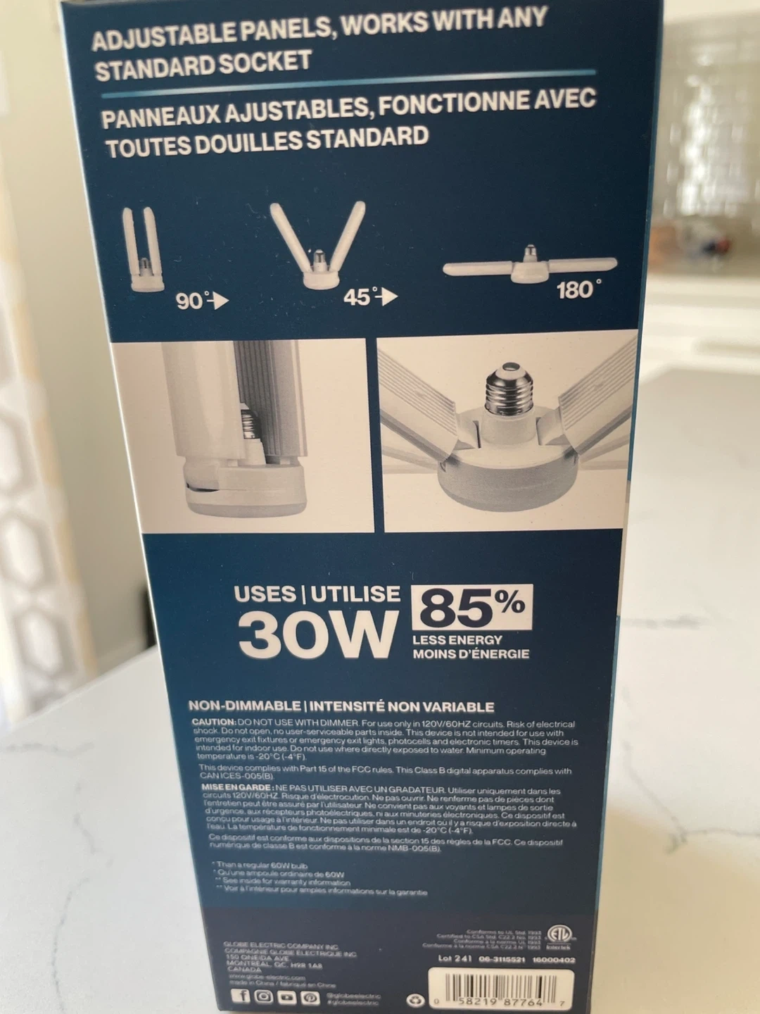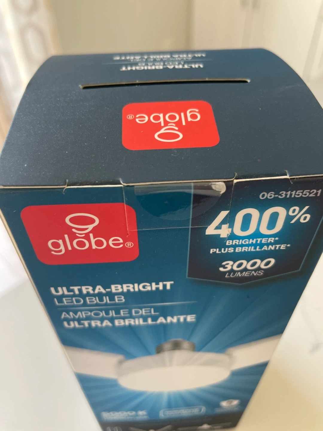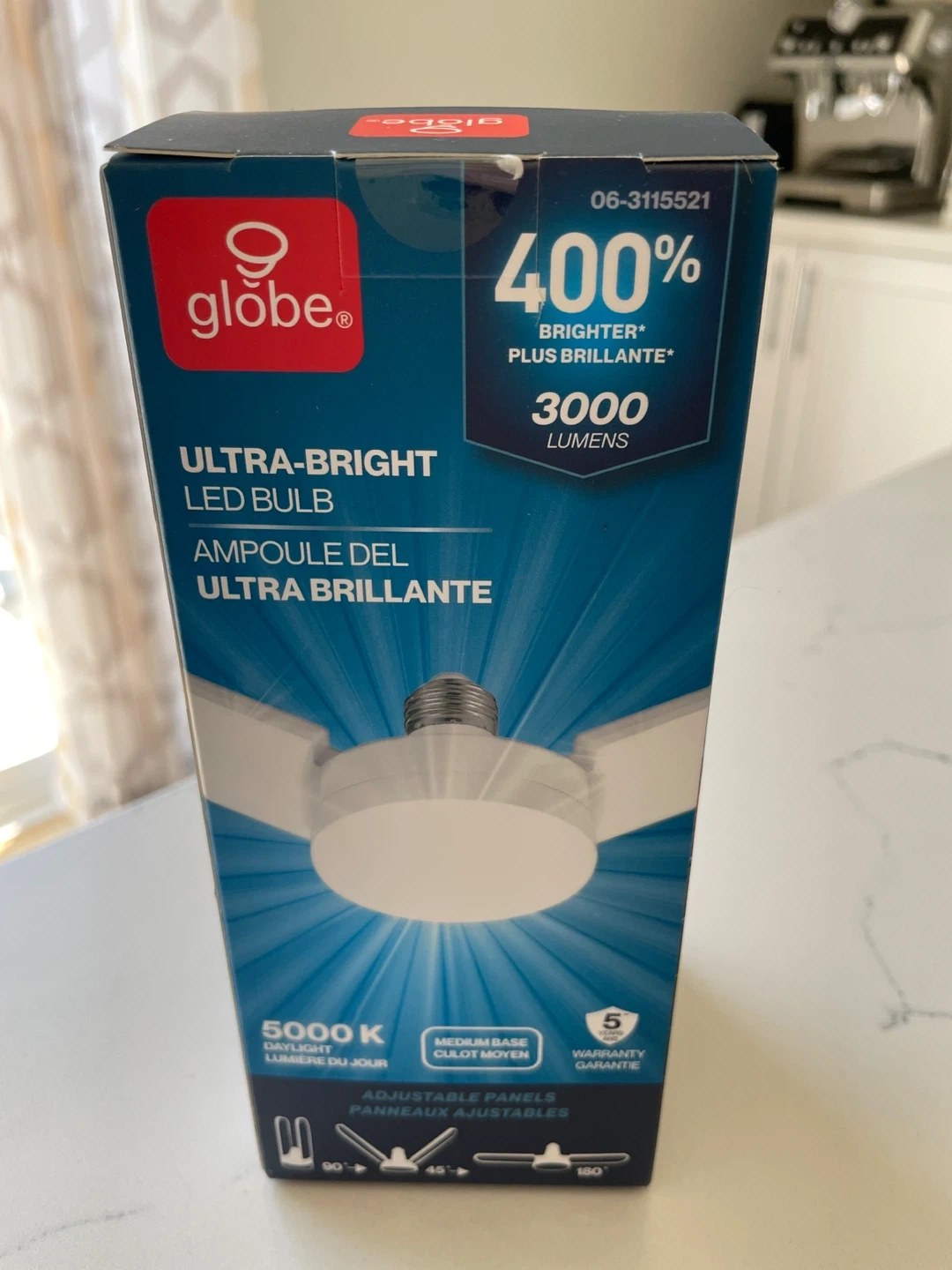 Sealed never opened. Brand new Globe Ultra-Bright LED bulb, still in its original packaging! This bulb is super bright, offering 400% more brightness and 3000 lumens. It uses only 30W and is 85% more energy efficient. The adjustable panels work with any standard socket, and it's perfect for laundry rooms, garages, basements, attics, and storage rooms