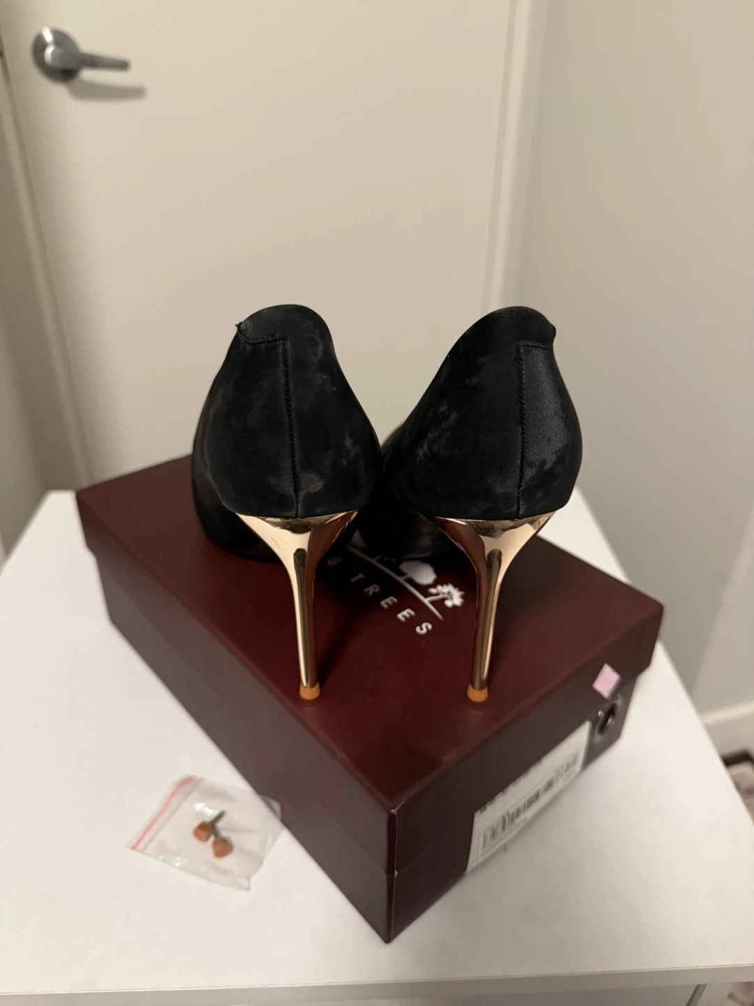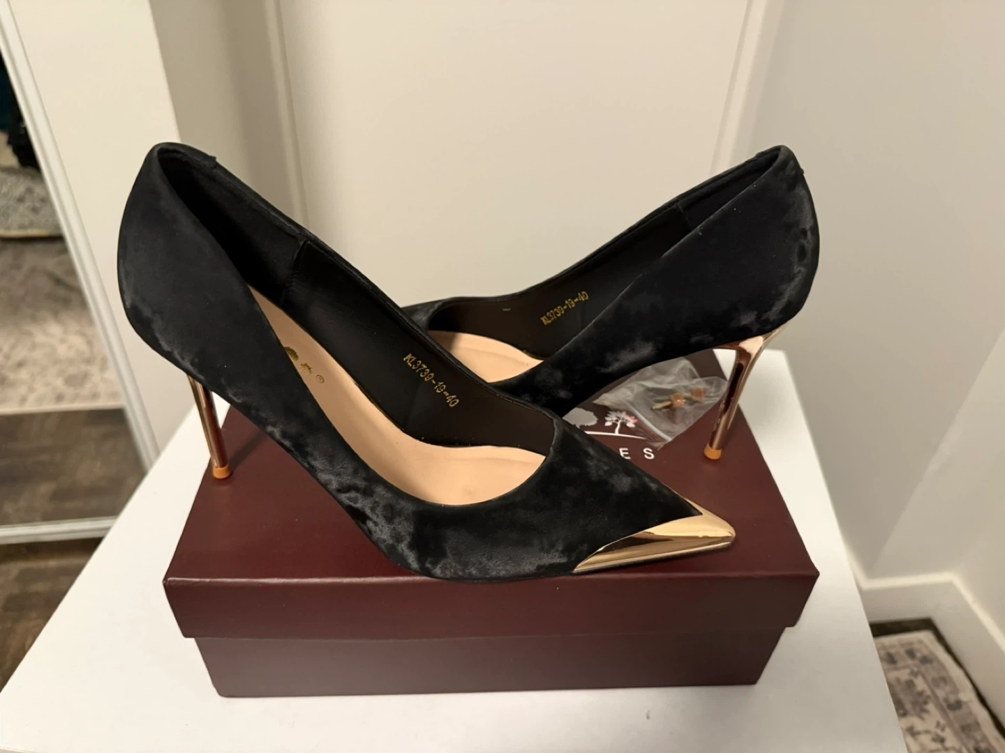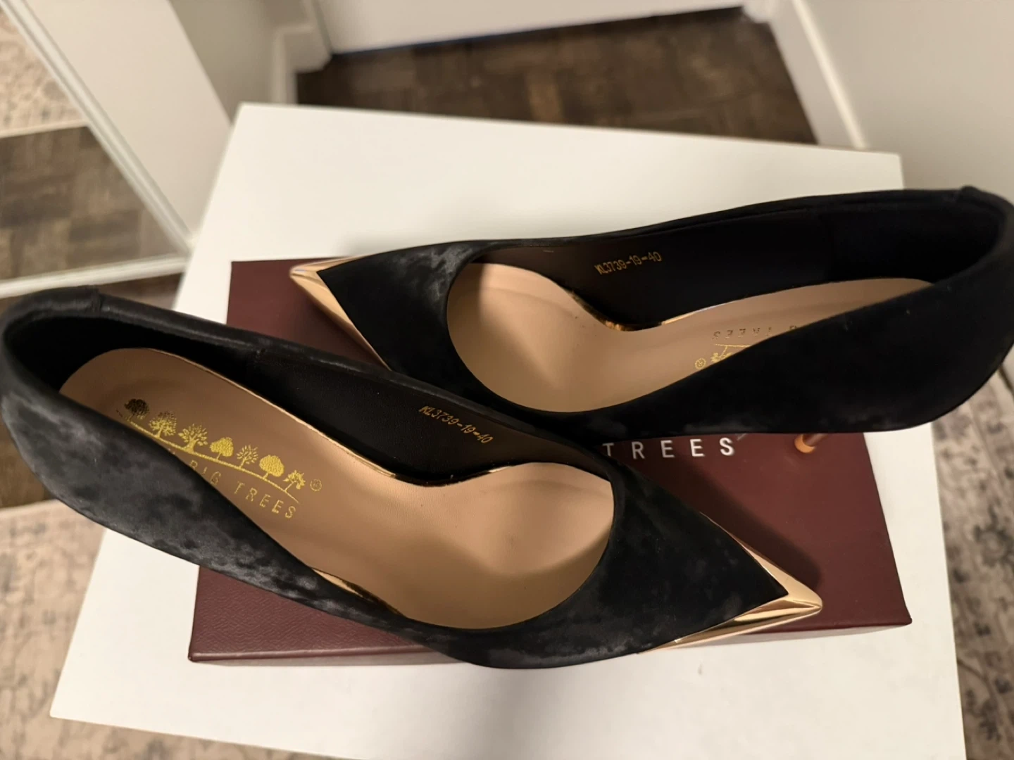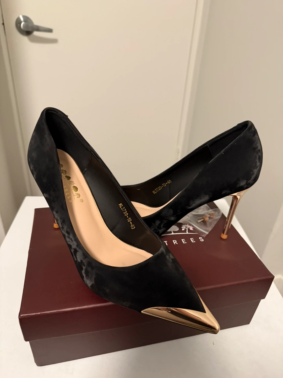 These stylish black heels from Gloria Trees are in great condition and come with their original box! They feature a sleek design with gold accents. The size is 40. Worn just once.