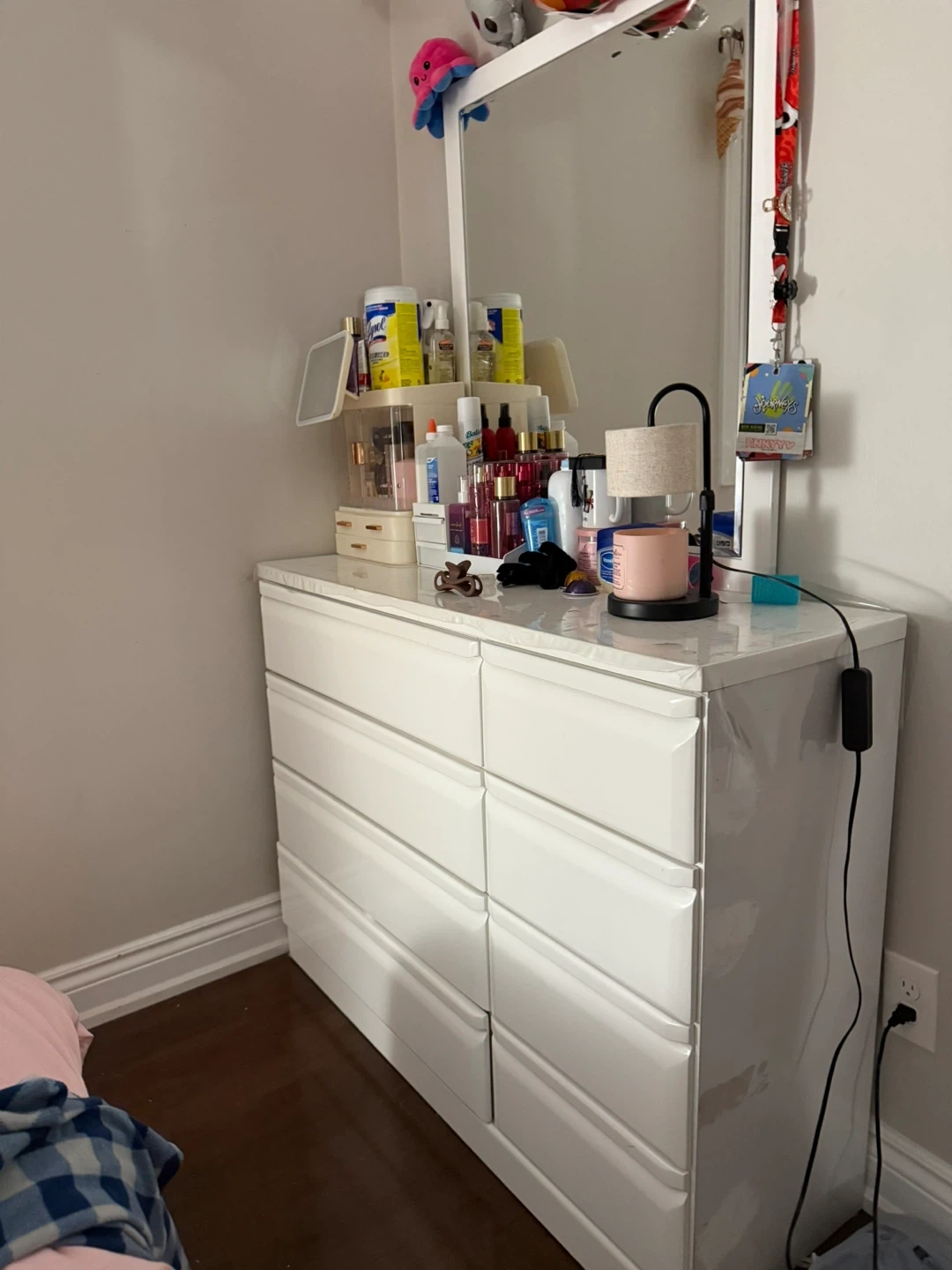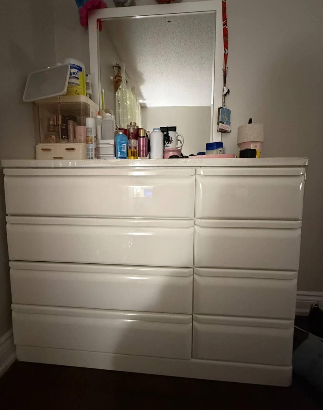 10Selling a white dresser with a mirror. It's in great condition and would be a lovely addition to any bedroom. The dresser has multiple drawers for ample storage space. Dm for more info, pickup only Everything is in inches: Length: 47 Width: 15.8 Height w/o mirror: 35.8 Mirror: 35.5 Height w mirror: 71.3 Drawer measurements: 30.8x13x5.5