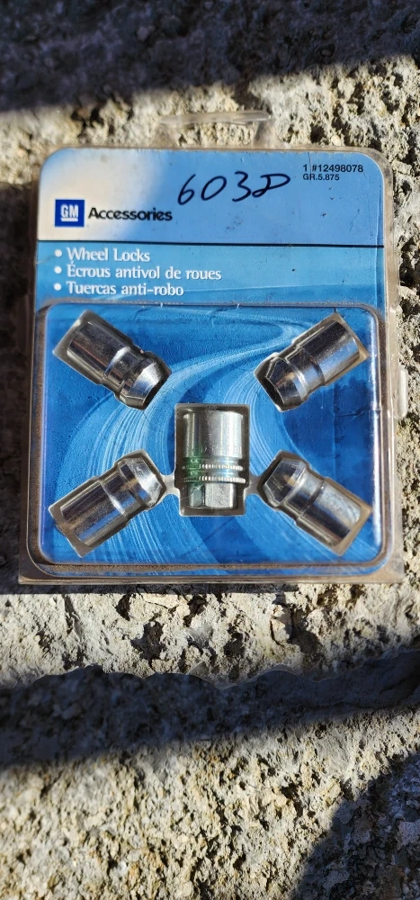 26Brand new GM Accessories wheel locks, still in the original packaging! These are part number 6038 and include everything you see in the picture for securing your wheels. metric thread 12 x 1.5