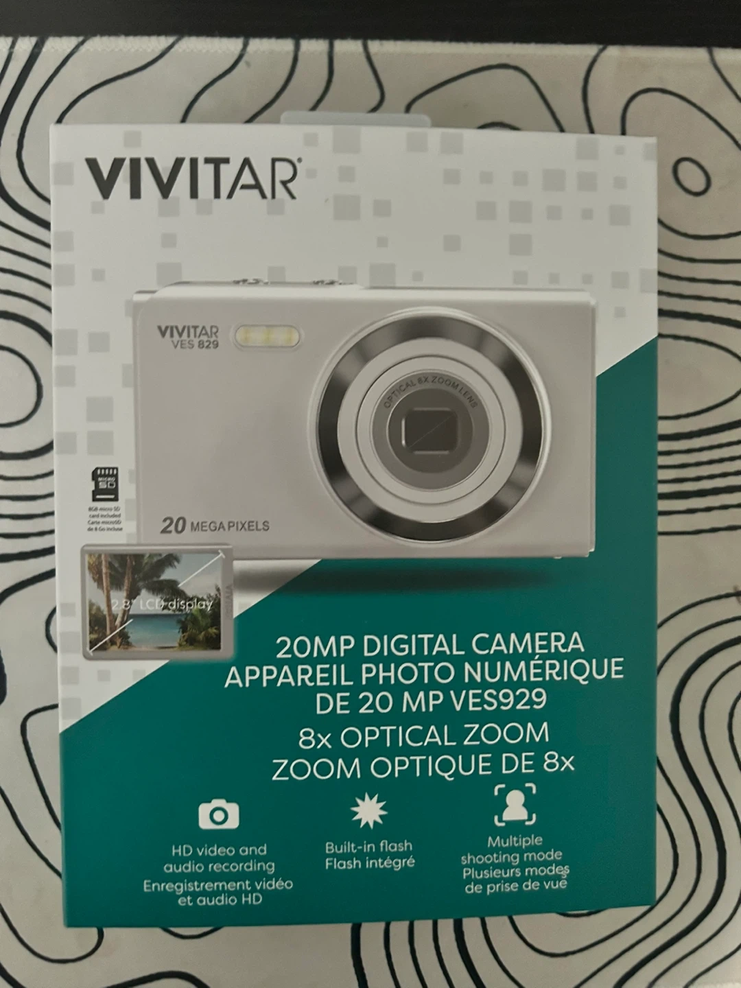 This is a Vivitar 20 megapixel digital camera with 8x optical zoom. It features HD video and audio recording, a built-in flash, and a 2.8" full-colour LCD display. It also includes a Type-C rechargeable battery