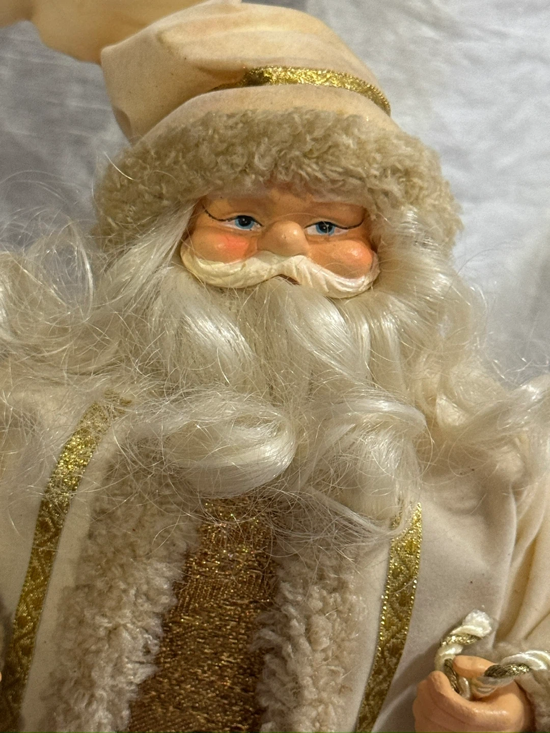 This festive Santa Claus figurine is dressed in a cream-coloured outfit with gold accents and faux fur trim. It's holding a sack filled with goodies and a staff. Perfect for adding a touch of holiday cheer to your home!