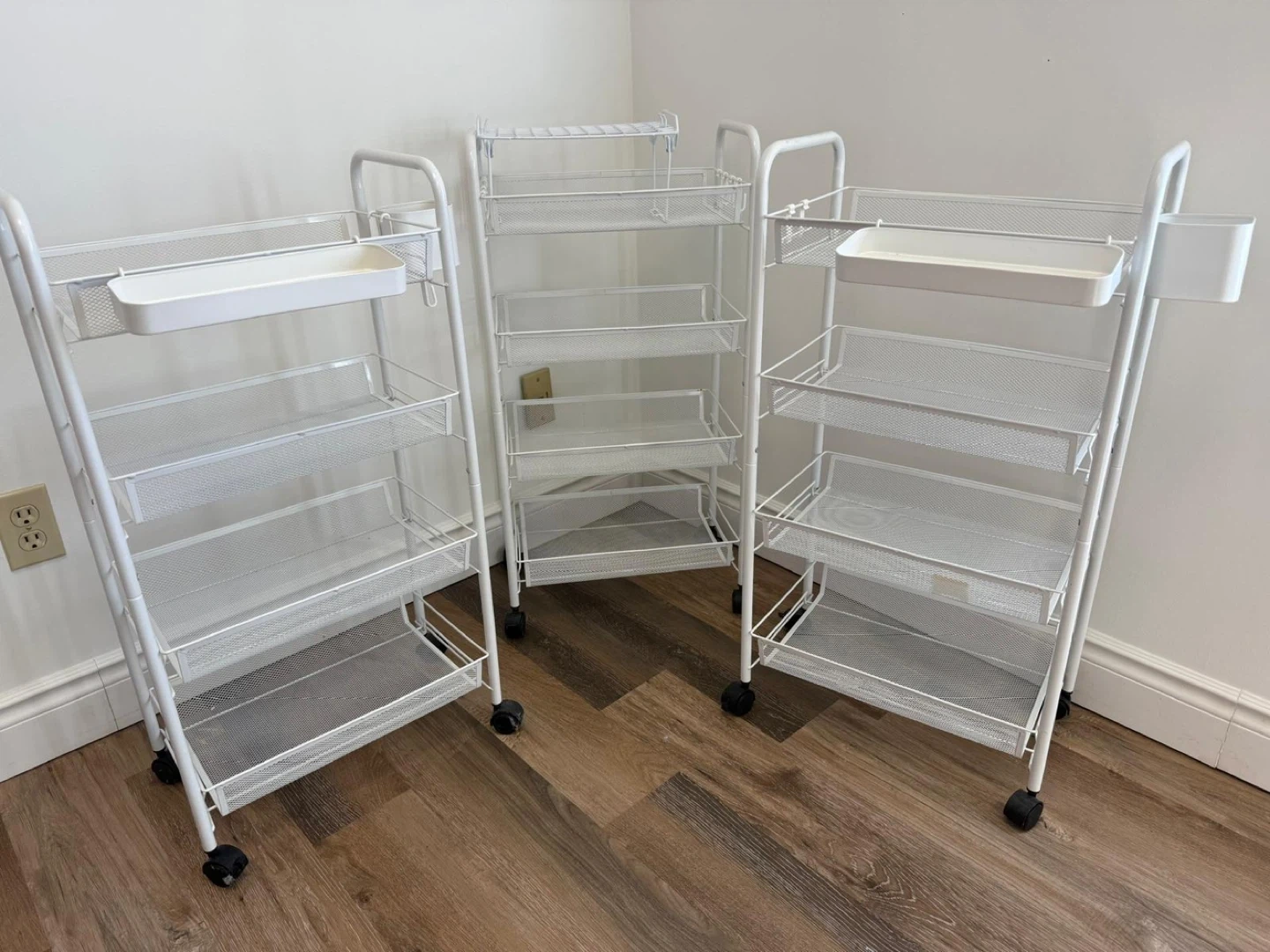 Three white mesh rolling storage carts are available. Each cart features three deep mesh baskets and comes with a removable top tray. They're perfect for organizing various items in different rooms.