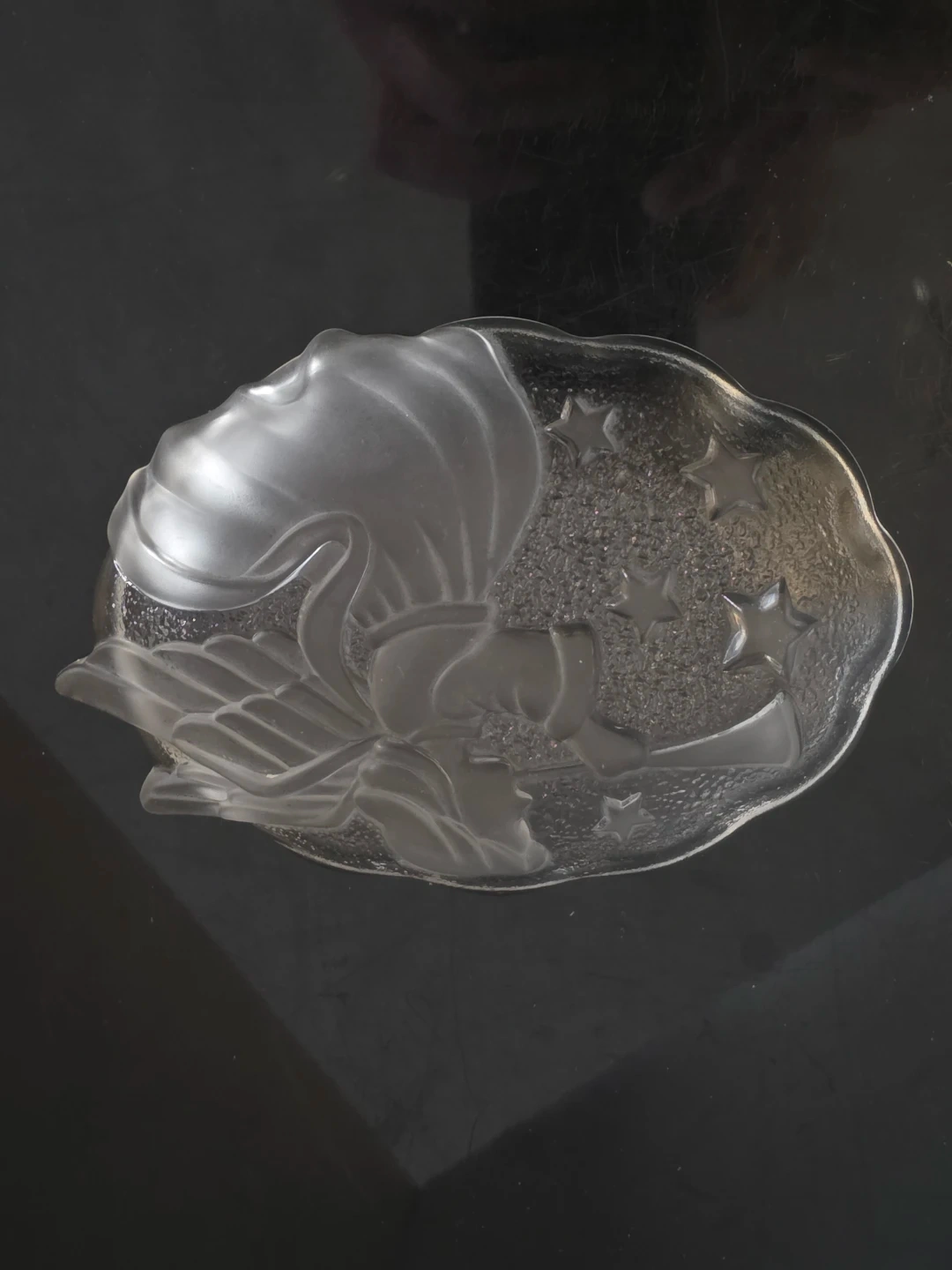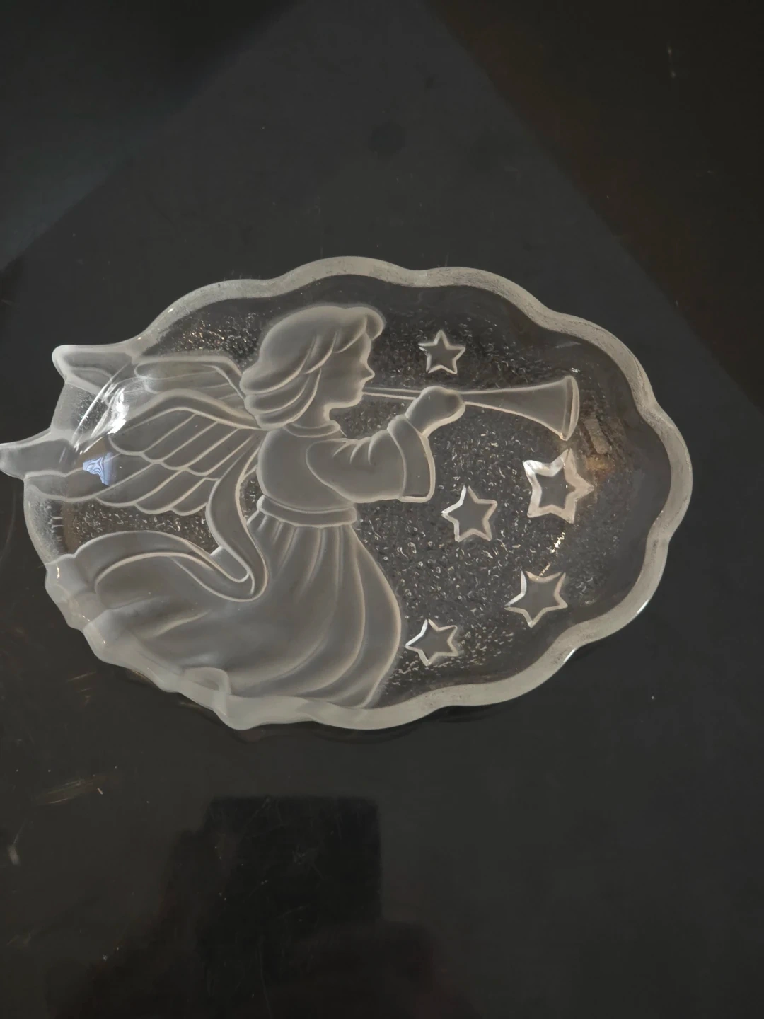 This item is a vintage Studio Nova "Angel's Herald" frosted glass Christmas candy dish, produced by Mikasa.