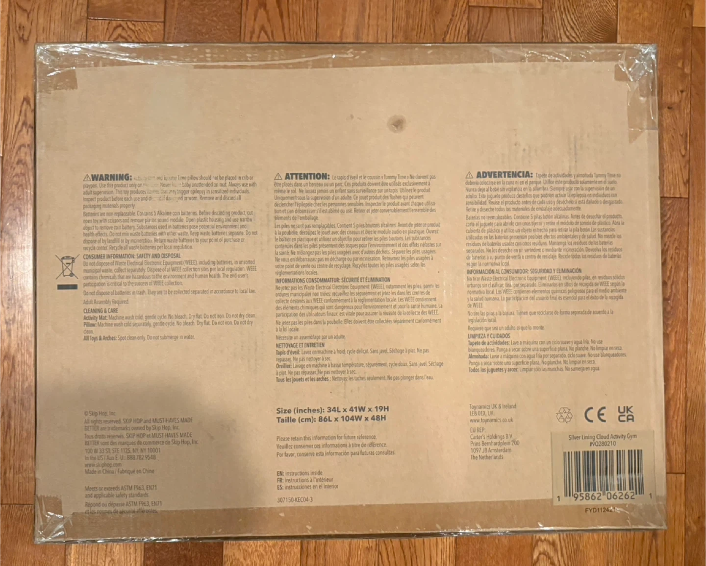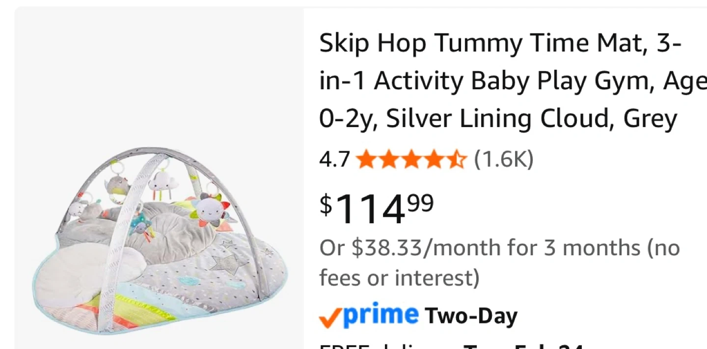 This Skip Hop Silver Lining Cloud play gym is designed for little ones aged 0-2 years. It features multiple plush toys that attach to the arch. The play mat has various textures and sensory elements for baby to explore.