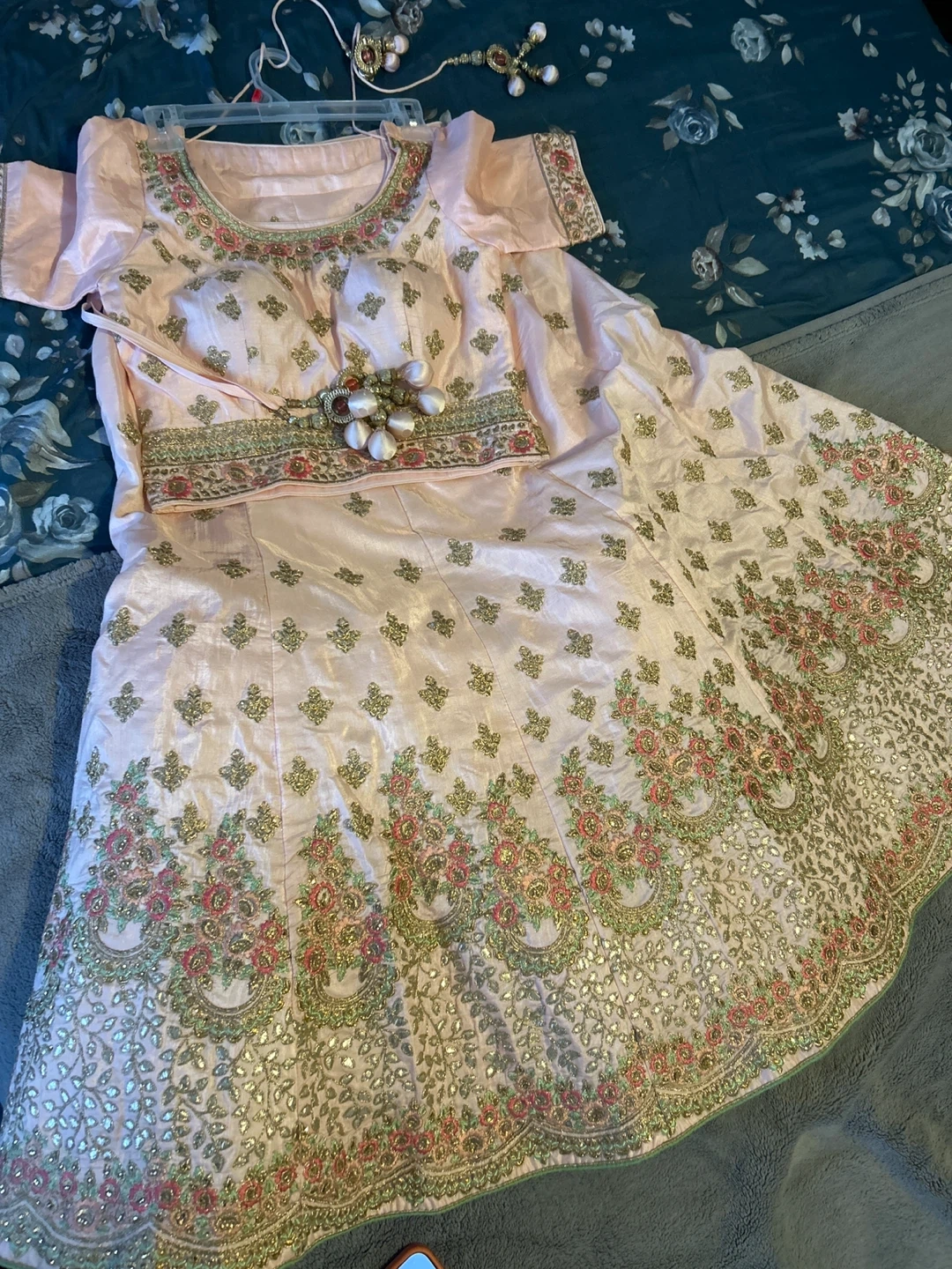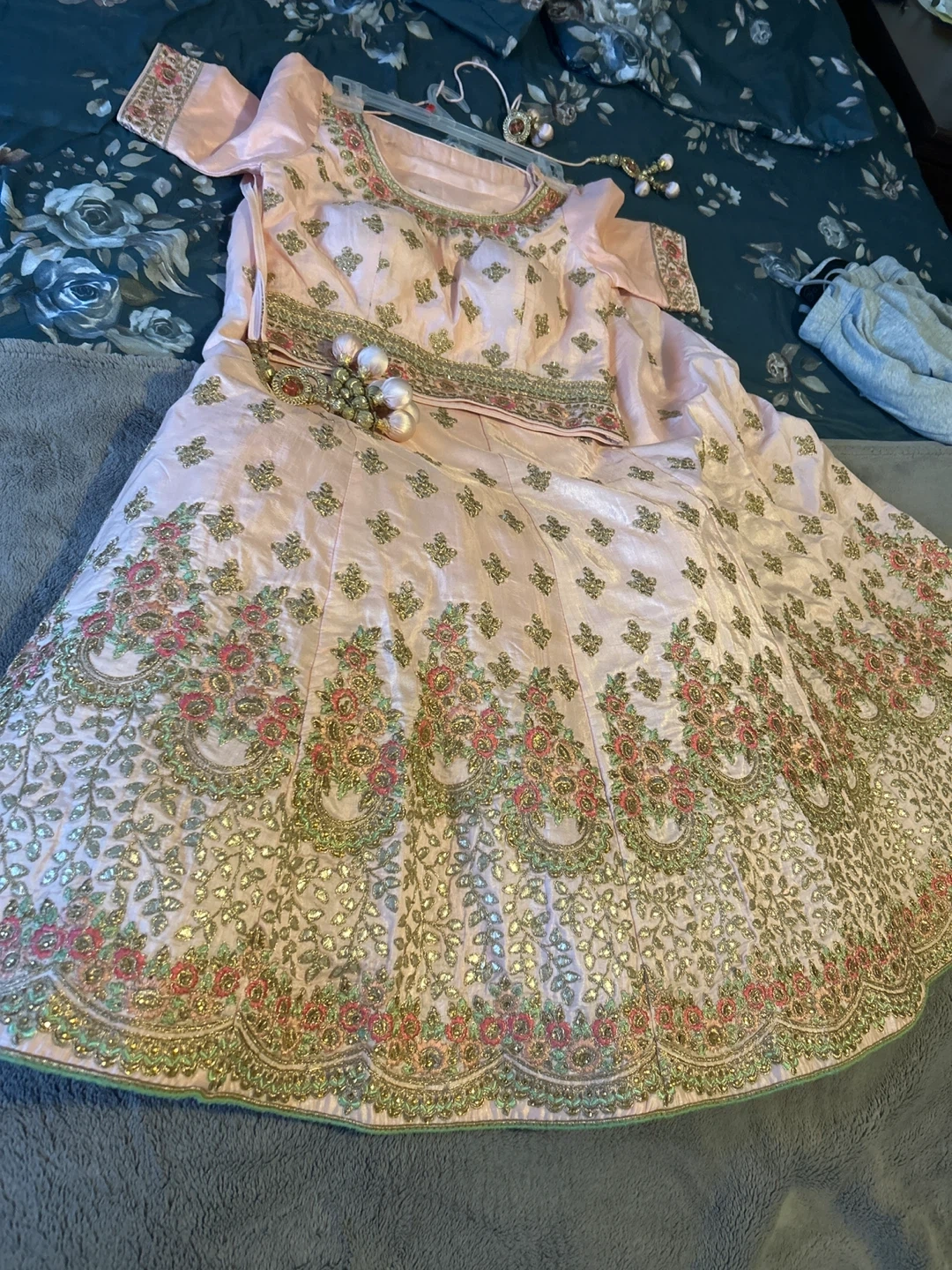 Beautiful pink lehenga choli set with two dupattas of different colours. One dupatta same colour and one contrast dupatta(sea green), perfect for a special occasion! The set includes a skirt, blouse, and dupatta. The fabric is intricately designed with floral patterns. It's in great condition and ready to wear!
