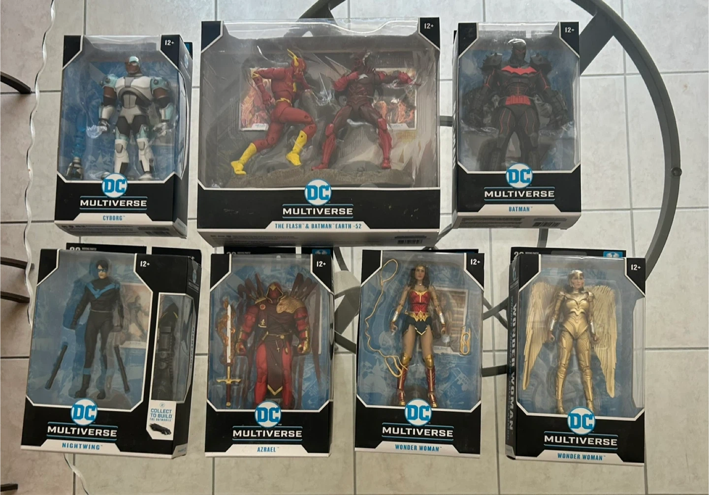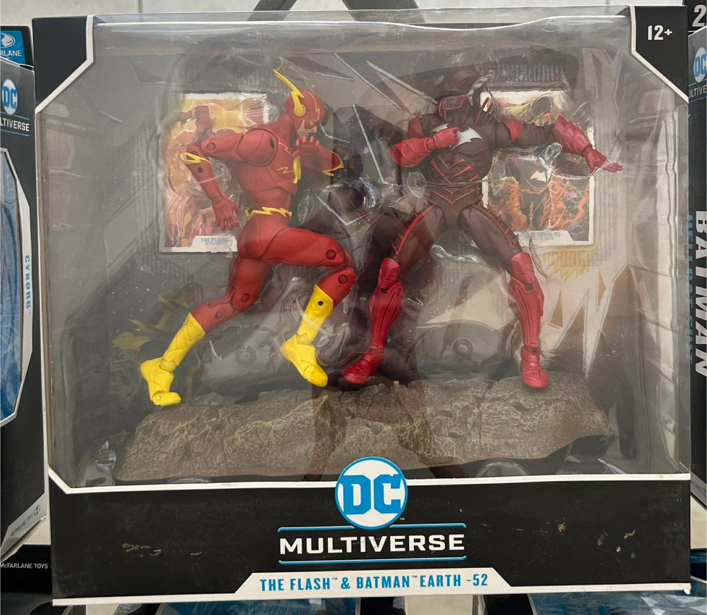 This DC Multiverse set features The Flash and Batman from Earth-52. Figures include accessories and a diorama base. The packaging is still sealed.