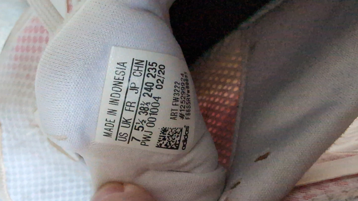 These Adidas running shoes are white with pink accents. The size is a women's 7 US, 5.5 UK, or 38.5 EUR. Made in Indonesia. Good for casual wear or light runs.