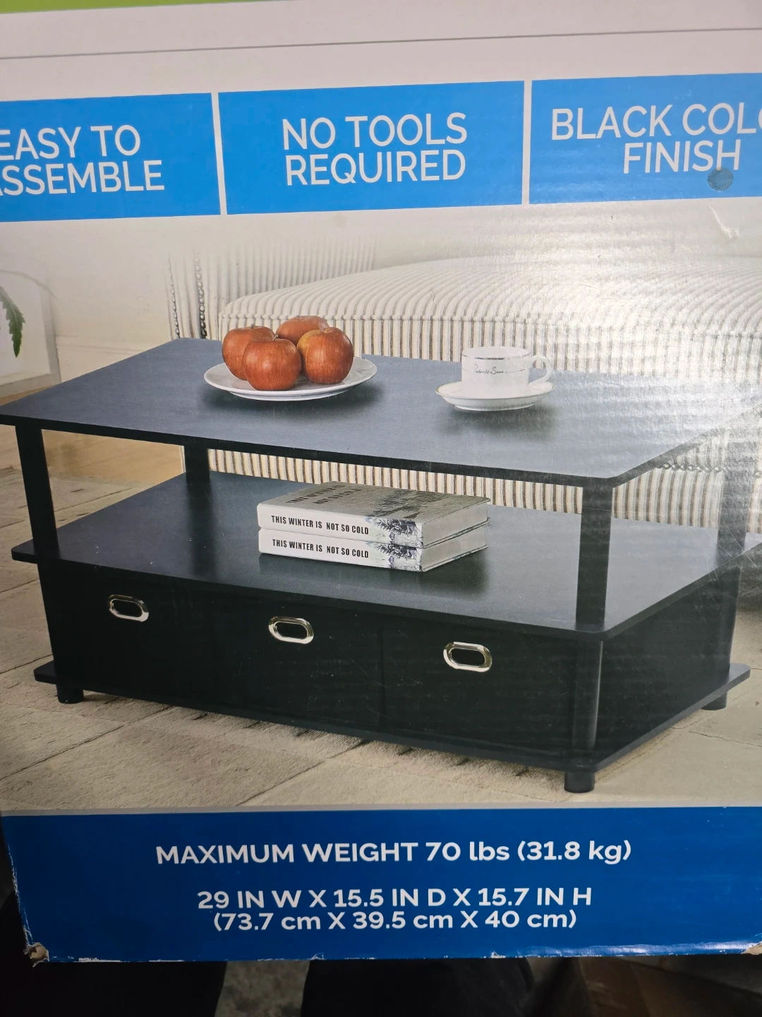 This is a black coffee table with bins. It's easy to assemble and requires no tools. The dimensions are 29" W X 15.5" D X 15.7" H. It has a maximum weight capacity of 70 lbs.