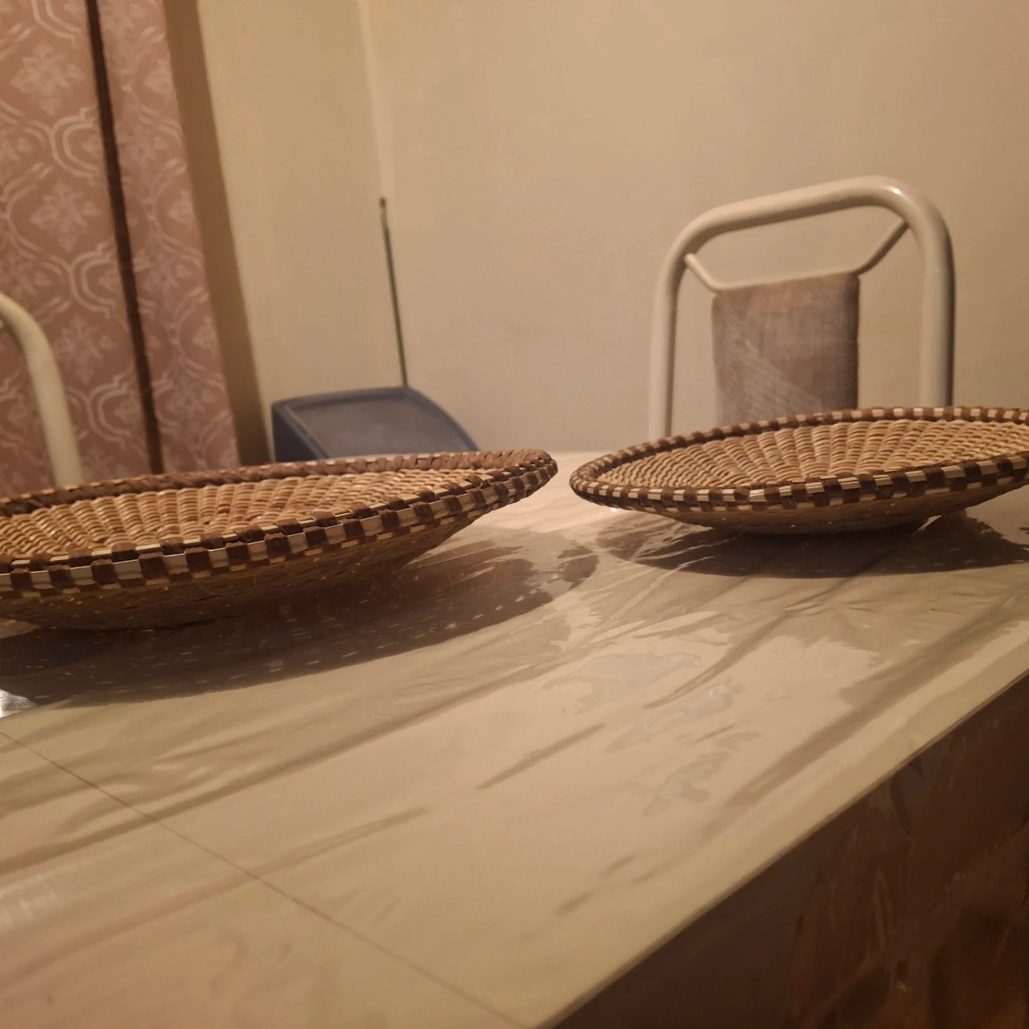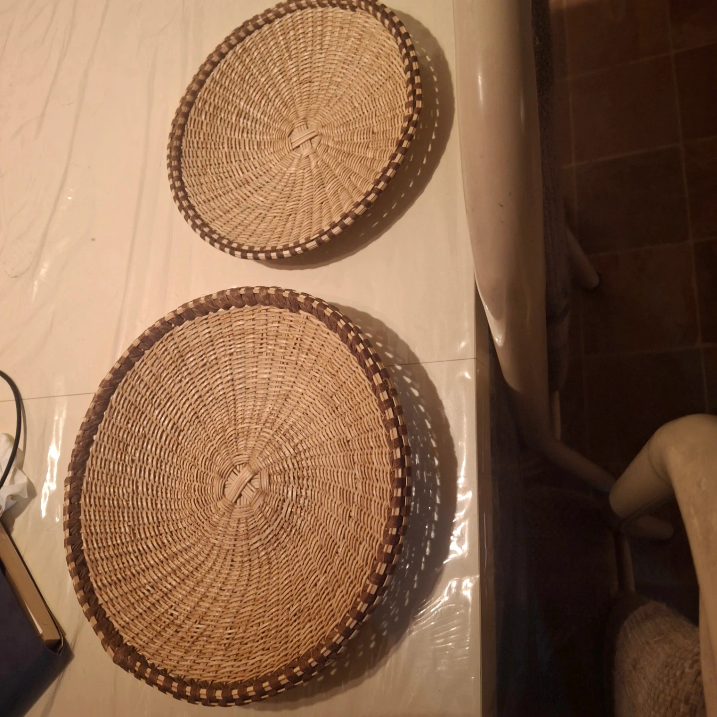 Two decorative woven baskets for display or storage. They're made from natural fibres with a checkered trim. Great for holding light items or as wall decor!