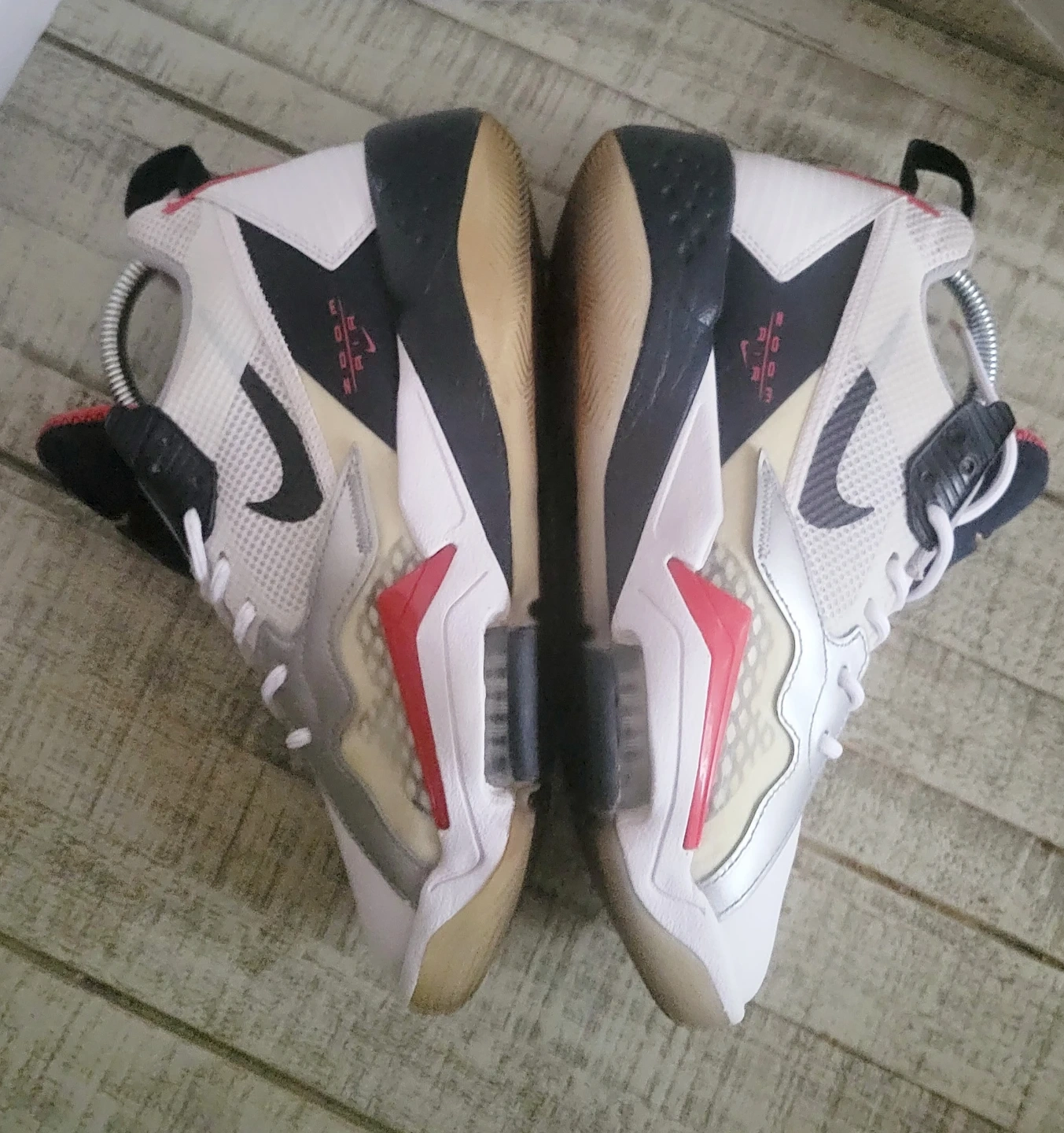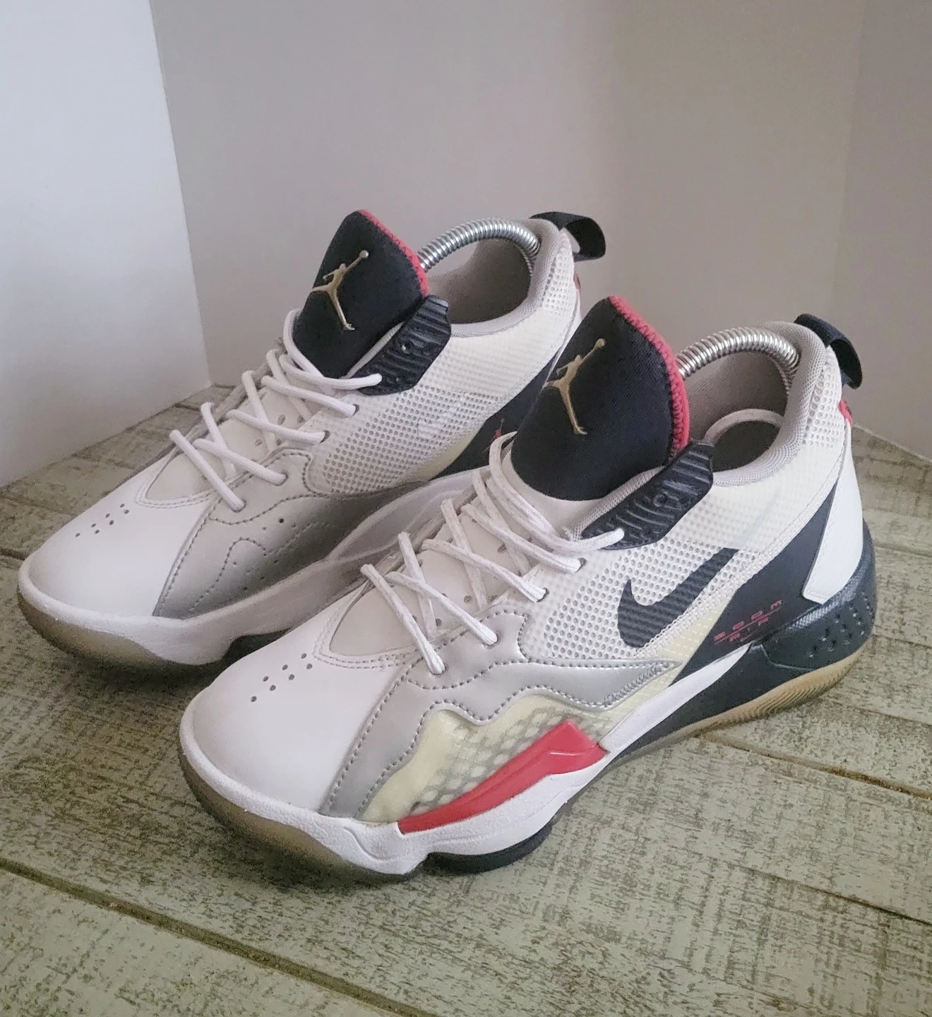 These Jordan kids' shoes are white with silver and red accents. They're a youth size 6Y (US) or 5.5 (UK). Great condition