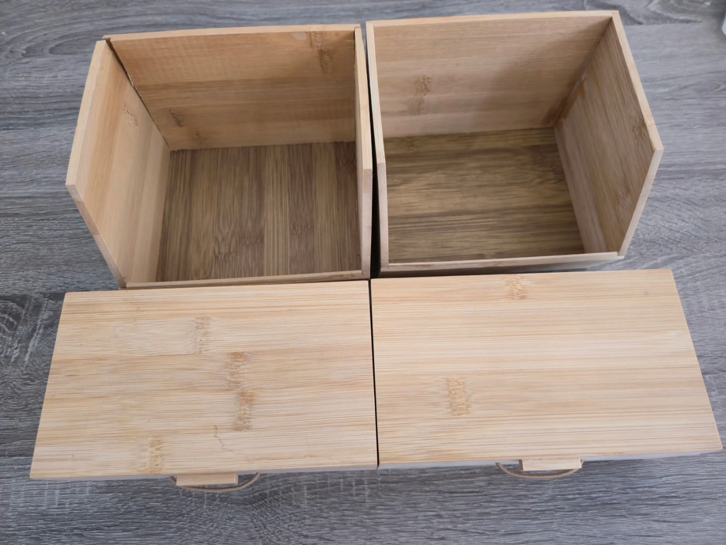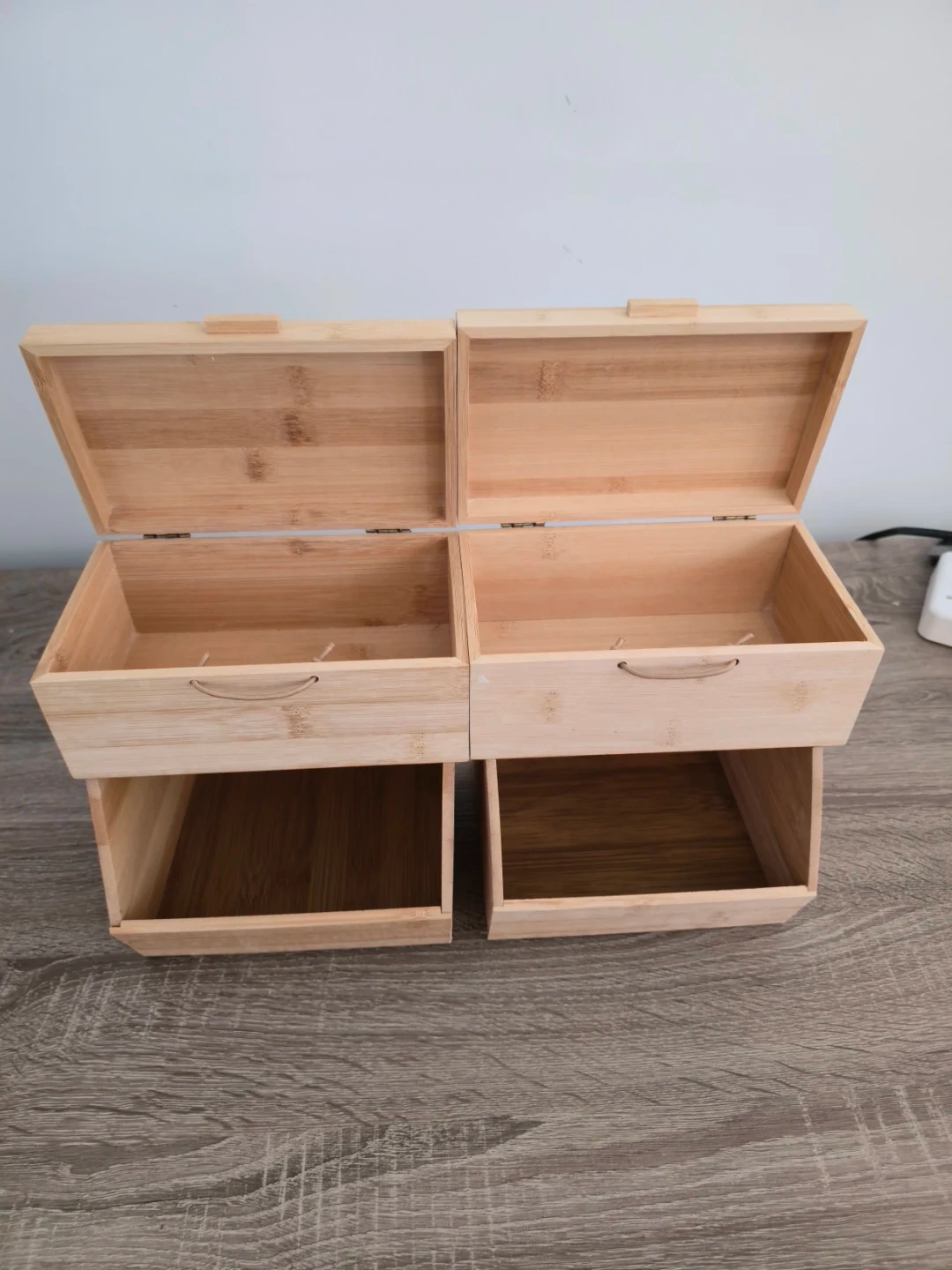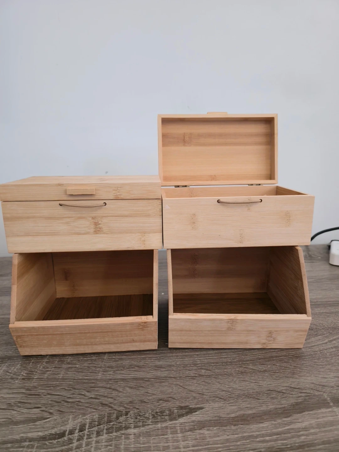 4 bamboo storage boxes two are with lids and 2 are open compartments. Perfect for organizing small items on a desk or shelf. They're made of natural bamboo.