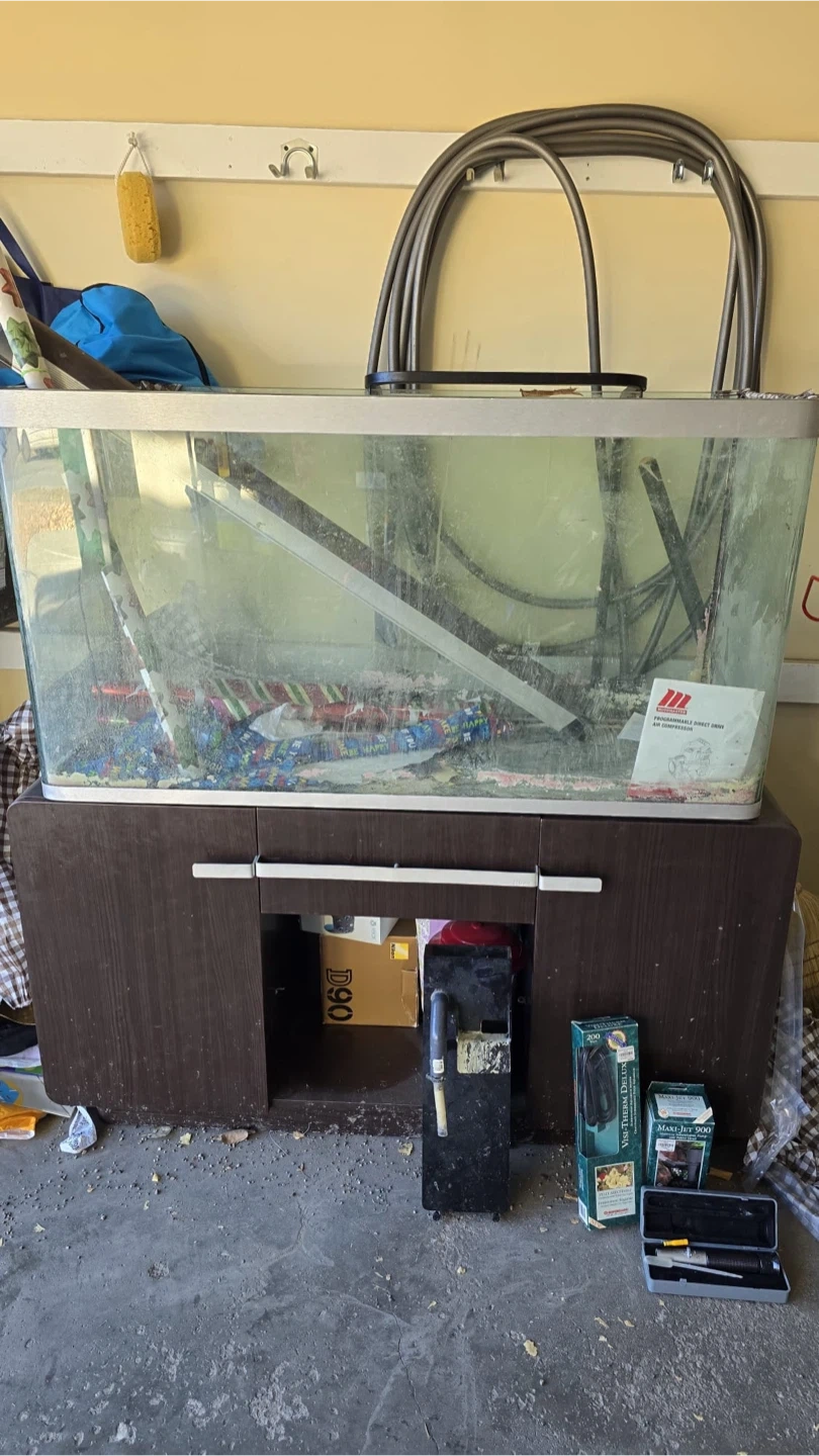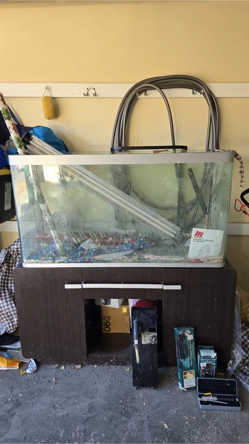80 Gallons aquarium with a wooden cabinet stand. Includes a Visi-Therm Deluxe submersible aquarium heater (200 watt) and a Maxi-Jet 900 submersible pump. A refractometer is also included for water testing. It's a complete setup for fish enthusiasts! Pickup from Nolan hill.