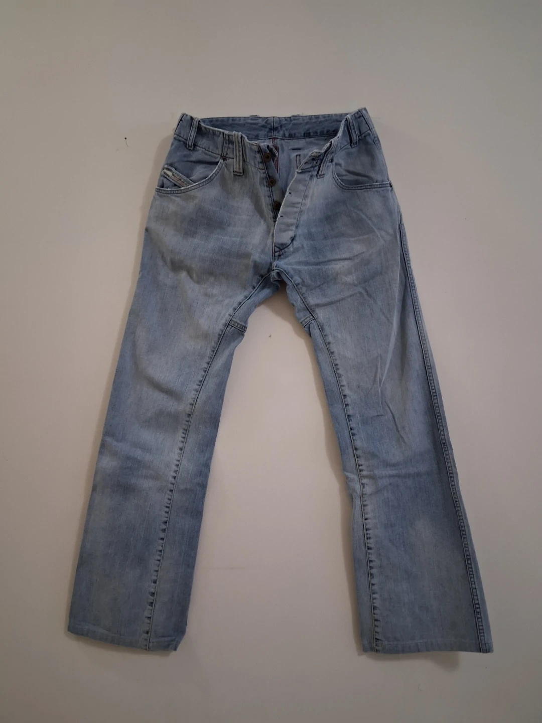 Diesel jeans in good condition. These are a light wash denim with a button fly and unique back pocket detailing. Perfect for a casual, stylish look!