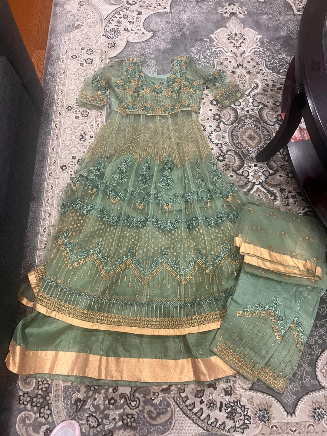 Beautiful mint green embroidered lehenga choli set with gold accents. Includes a matching dupatta. Perfect for special occasions!