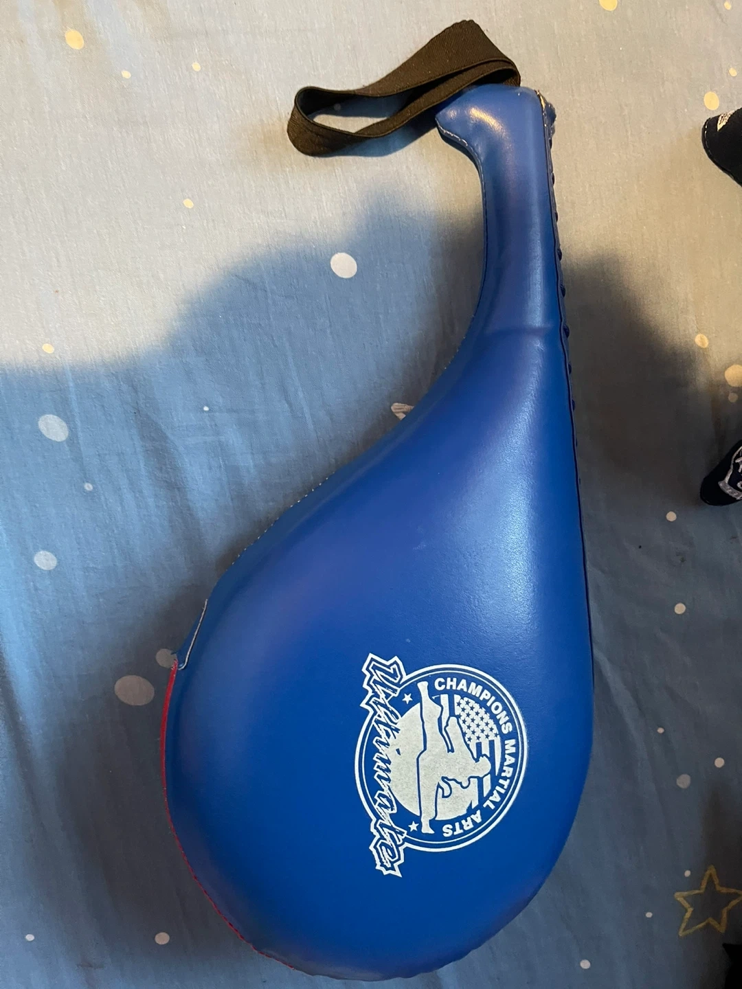 This blue Dynamics kick pad is designed for martial arts training. It features a sturdy construction suitable for practice. This pad is a great tool for developing kicking techniques.