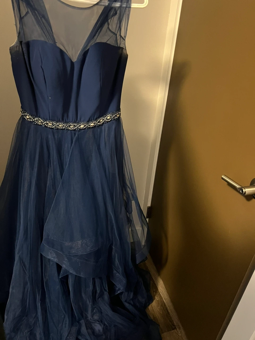 Selling a beautiful navy blue dress from Ed Young in size M. It features a lovely design with a jeweled belt detail. Perfect for a special occasion!