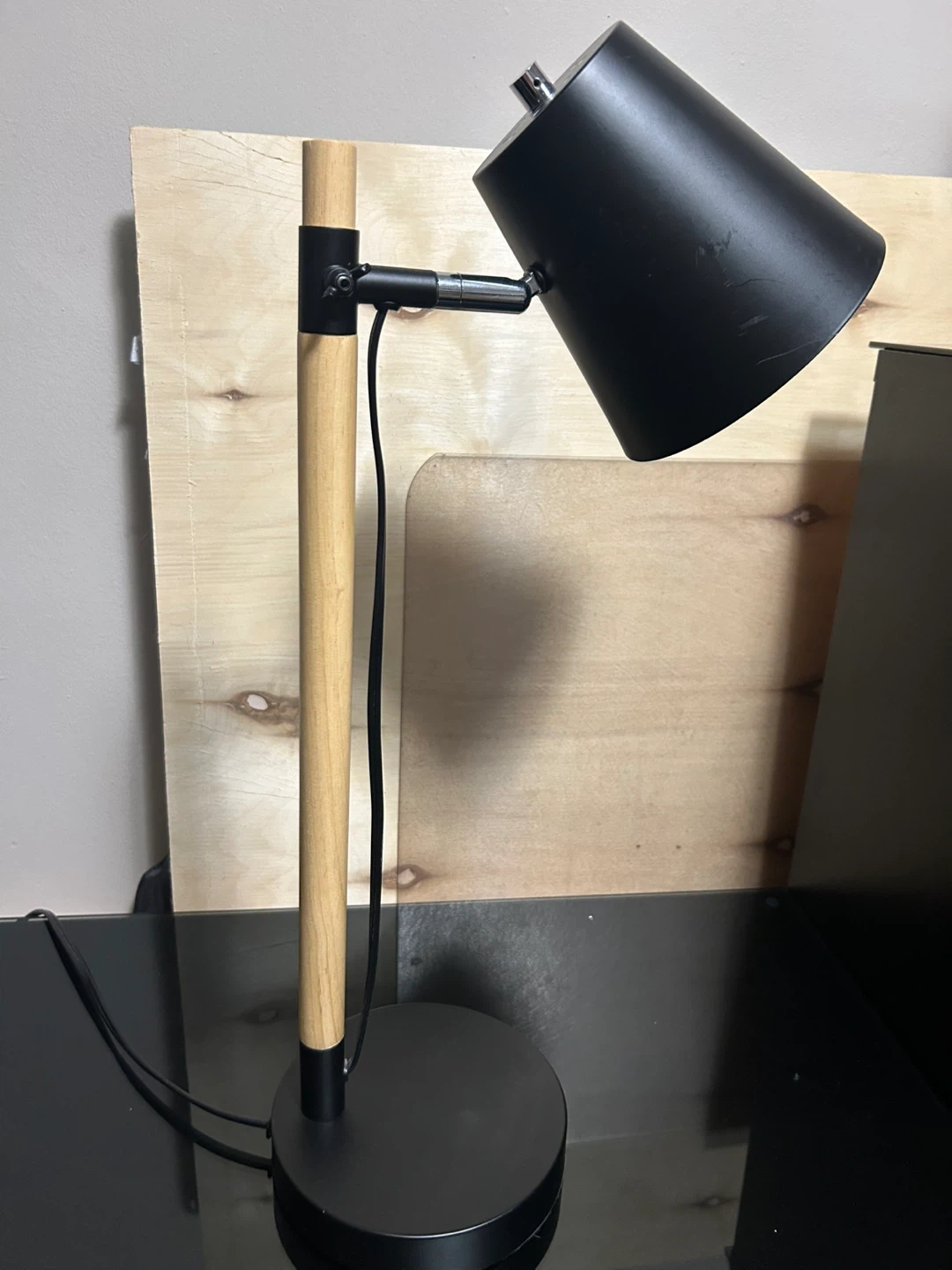 This black desk lamp features a stylish wood accent on the stand. It includes one USB ports on the base for convenient charging. Its adjustable arm and head allow you to direct the light where you need it most. Works well for task lighting.