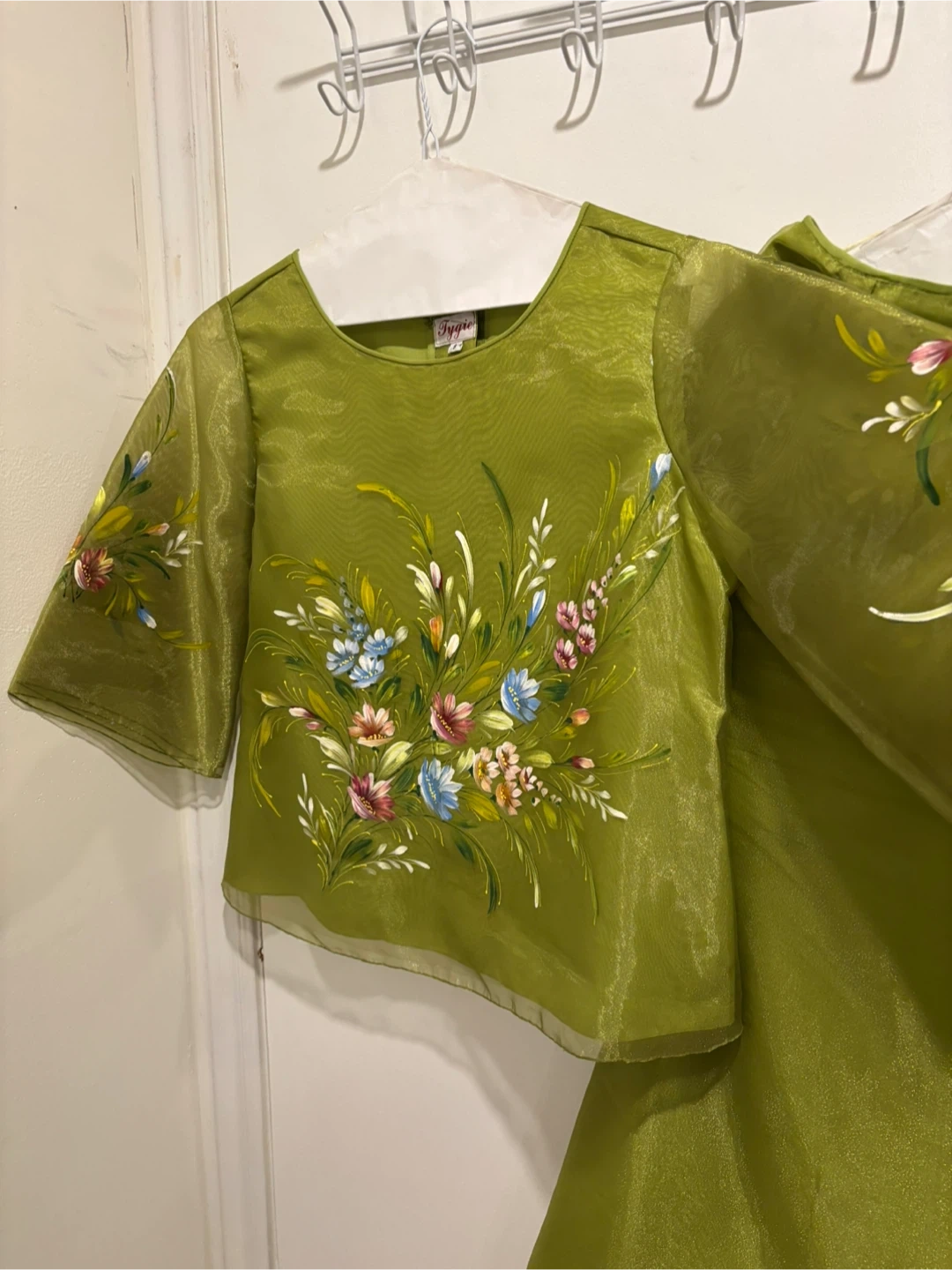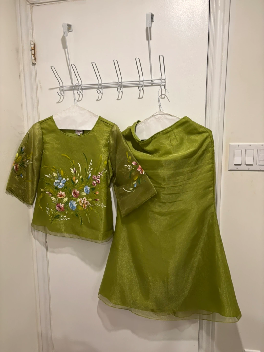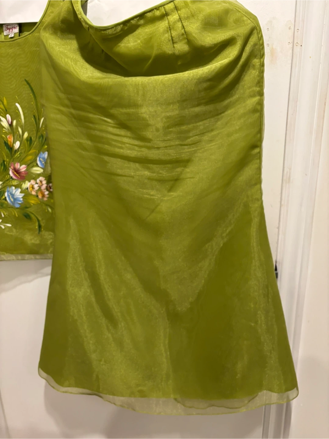 A lovely lime green sheer top and skirt set with delicate floral embroidery on the sleeves and front of the top. The fabric has a subtle sheen. It's perfect for a special occasion or dress-up.