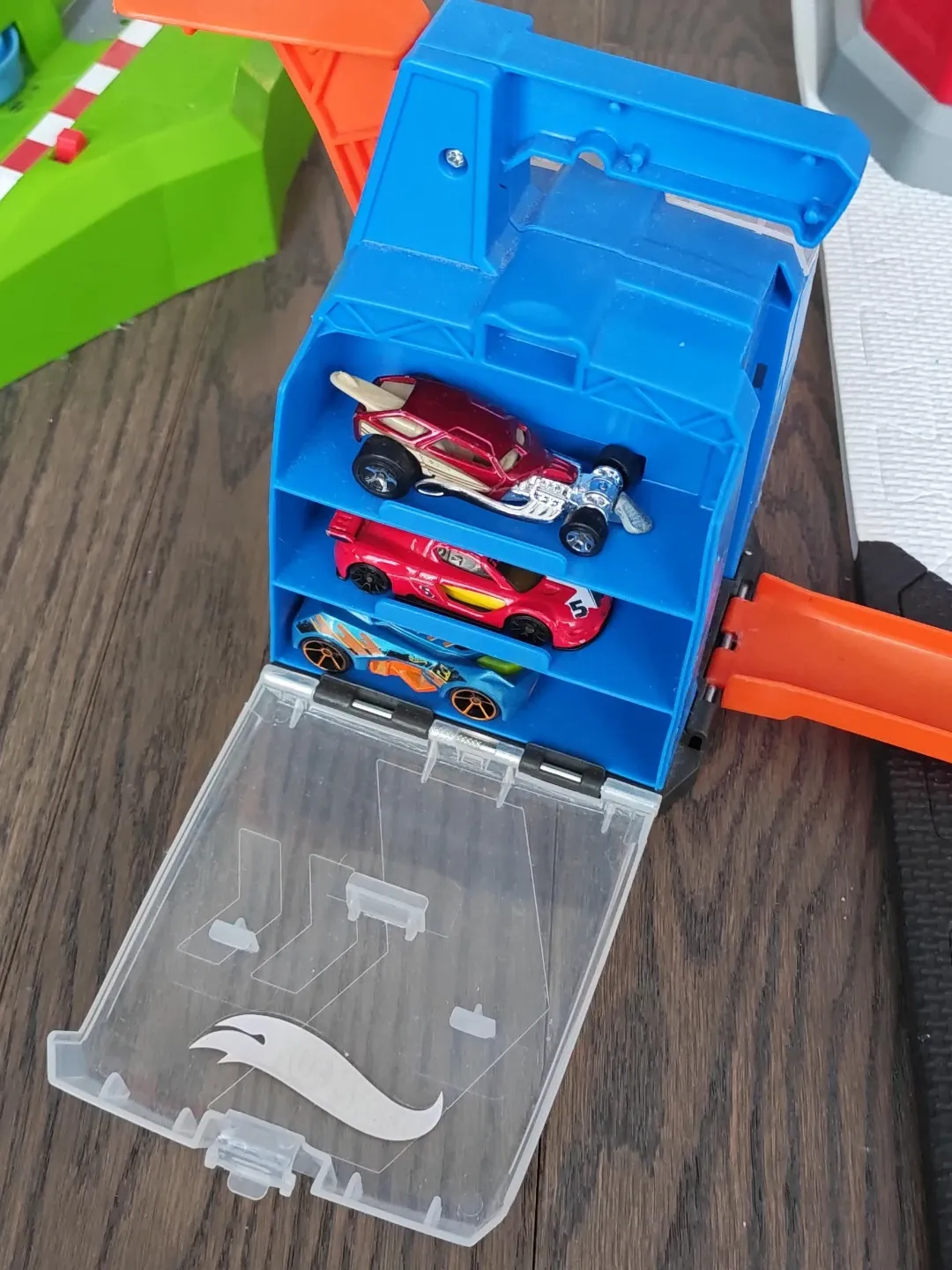 This Hot Wheels car carrier playset comes with a blue and orange carrier and five die-cast cars. It's great for storing and transporting your Hot Wheels collection!