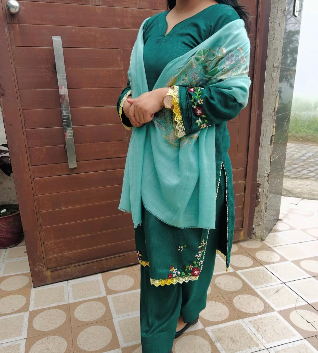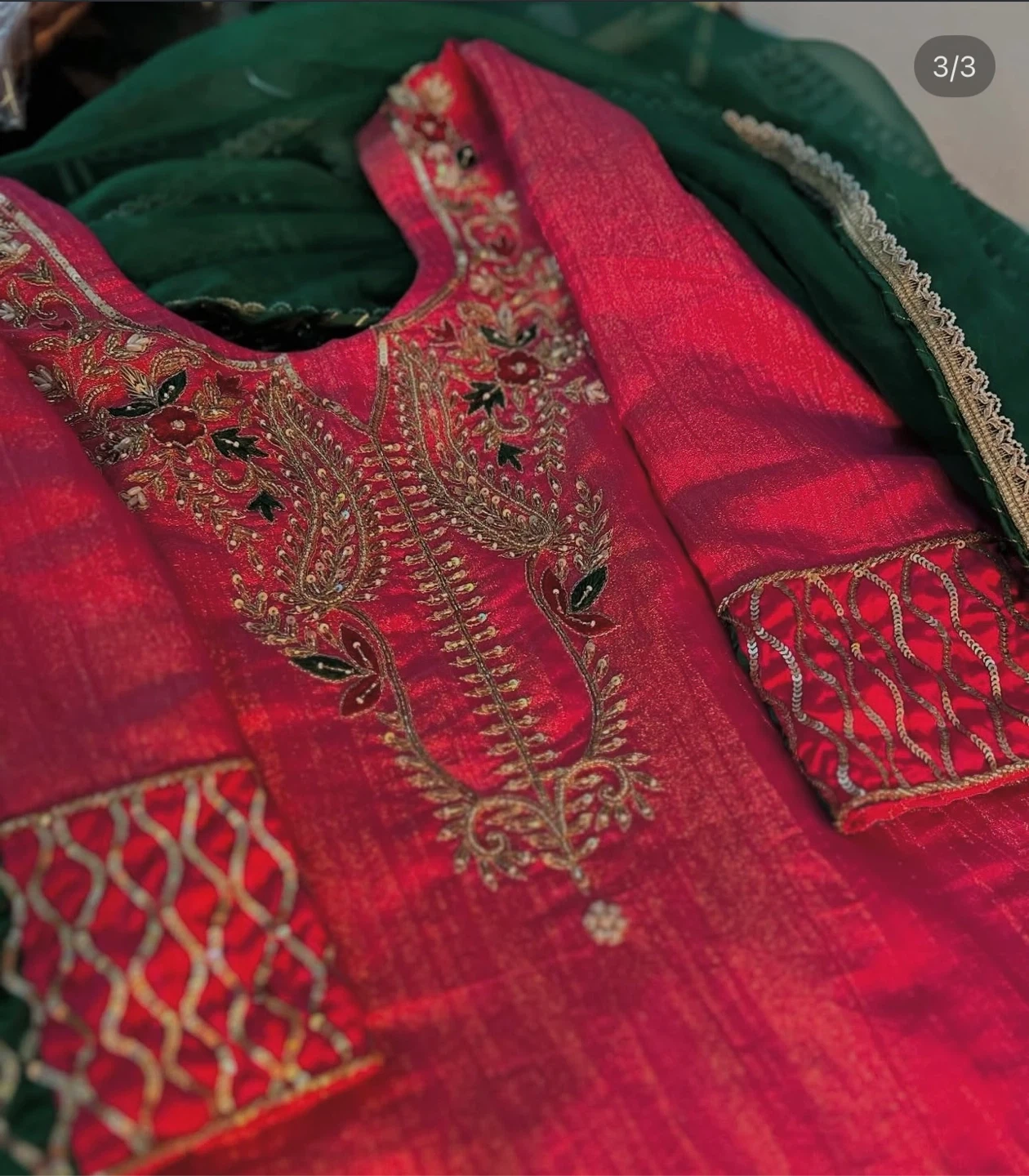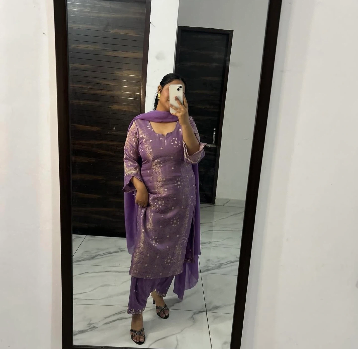A beautiful purple kurti with matching pants and a sheer dupatta. The kurti features intricate embroidery with gold accents. Perfect for festive occasions or parties! Dm for more details