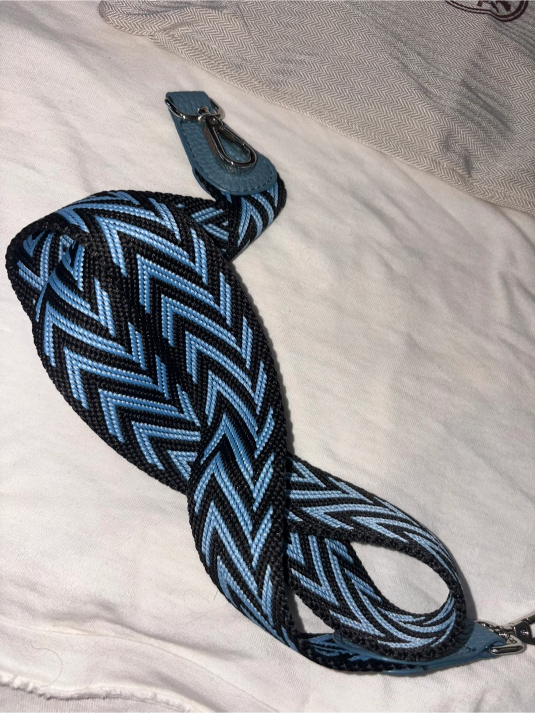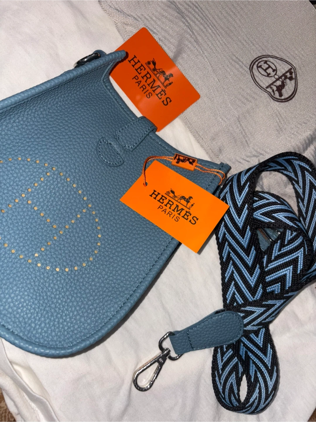 This is a blue leather shoulder bag from Hermès Paris. It comes with a matching adjustable strap and is presented in its dust bag. The bag features a simple snap closure and decorative perforations.
