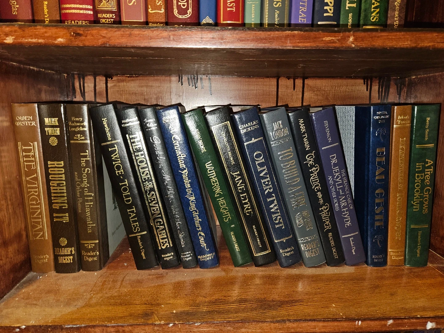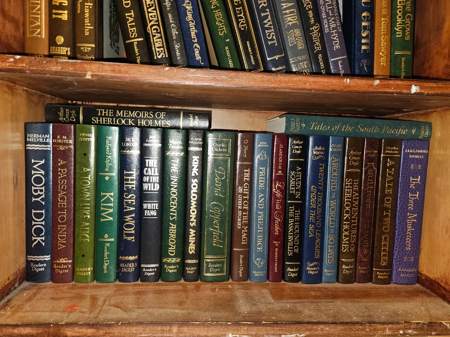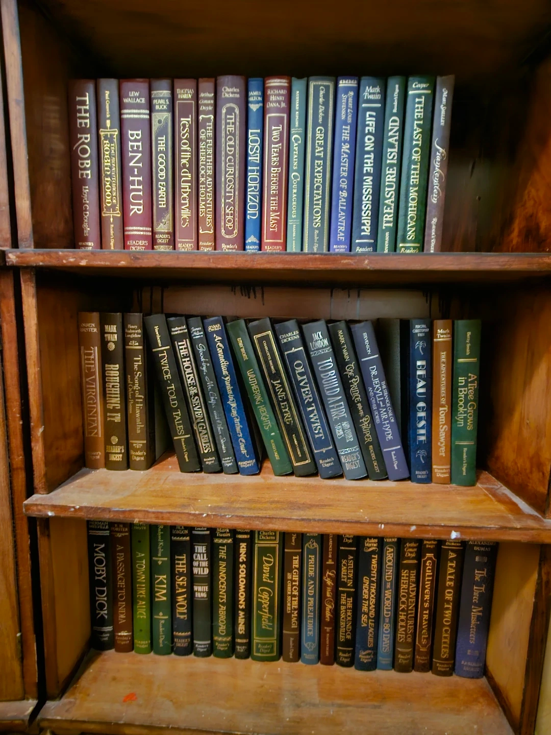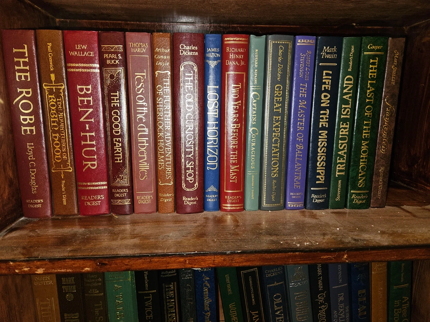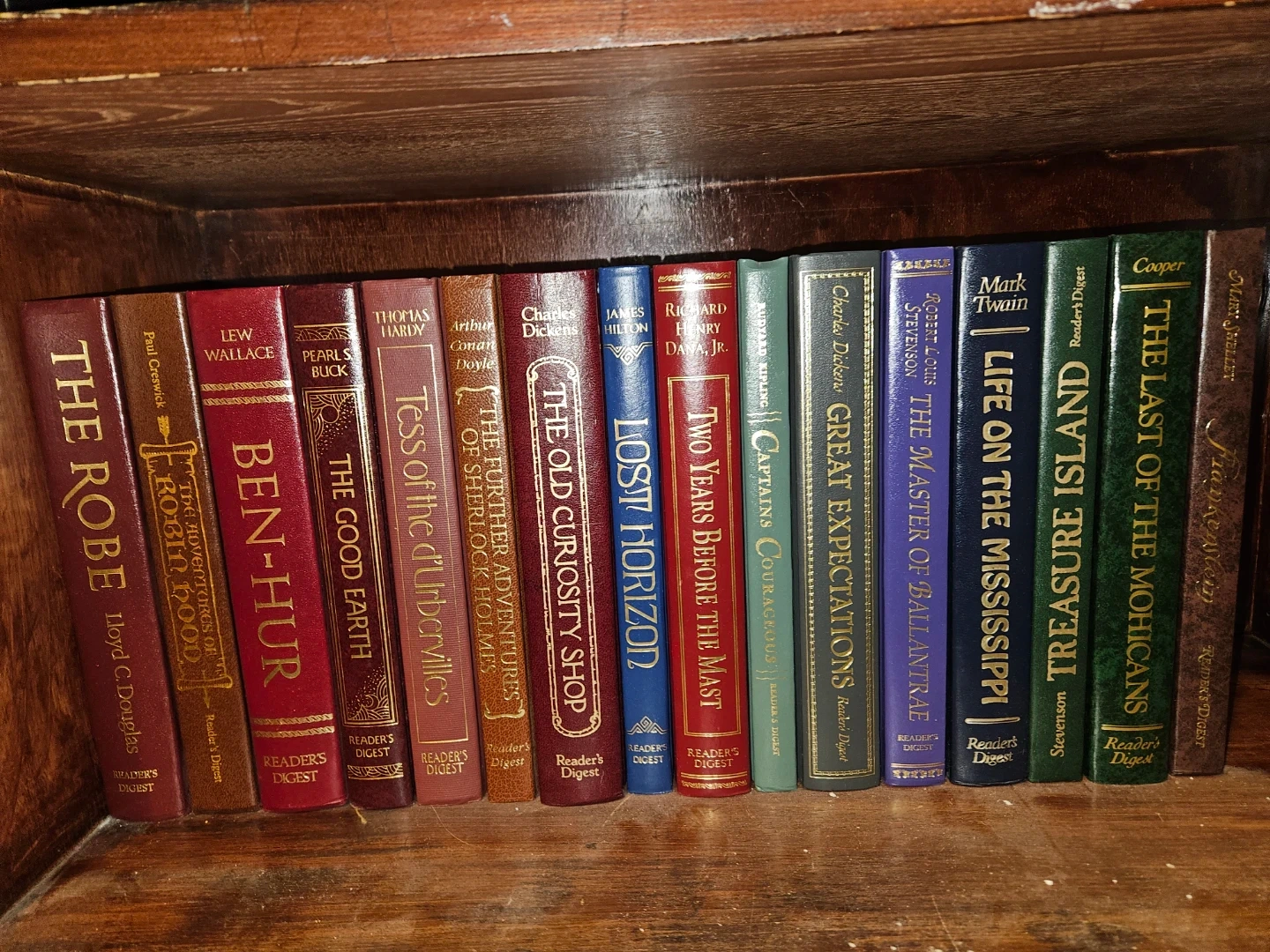 This is a collection of classic novels published by Reader's Digest. Titles include 'The Robe', 'Ben-Hur', 'The Good Earth', 'Tess of the D'Urbervilles', 'The Further Adventures of Sherlock Holmes', 'The Old Curiosity Shop', 'Lost Horizon', 'Two Years Before the Mast', 'Captains Courageous', 'Great Expectations', 'The Master of Ballantrae', 'Life on the Mississippi', 'Treasure Island', and 'The Last of the Mohicans'. Many feature authors like Charles Dickens, Mark Twain, and Robert Louis Stevenson.asking 100$ OBO for the set