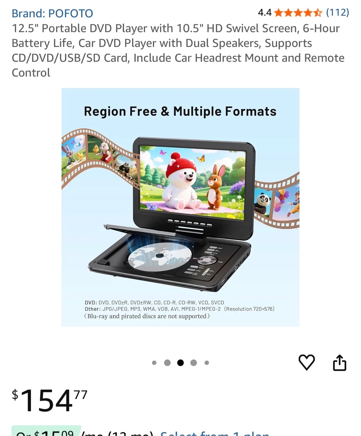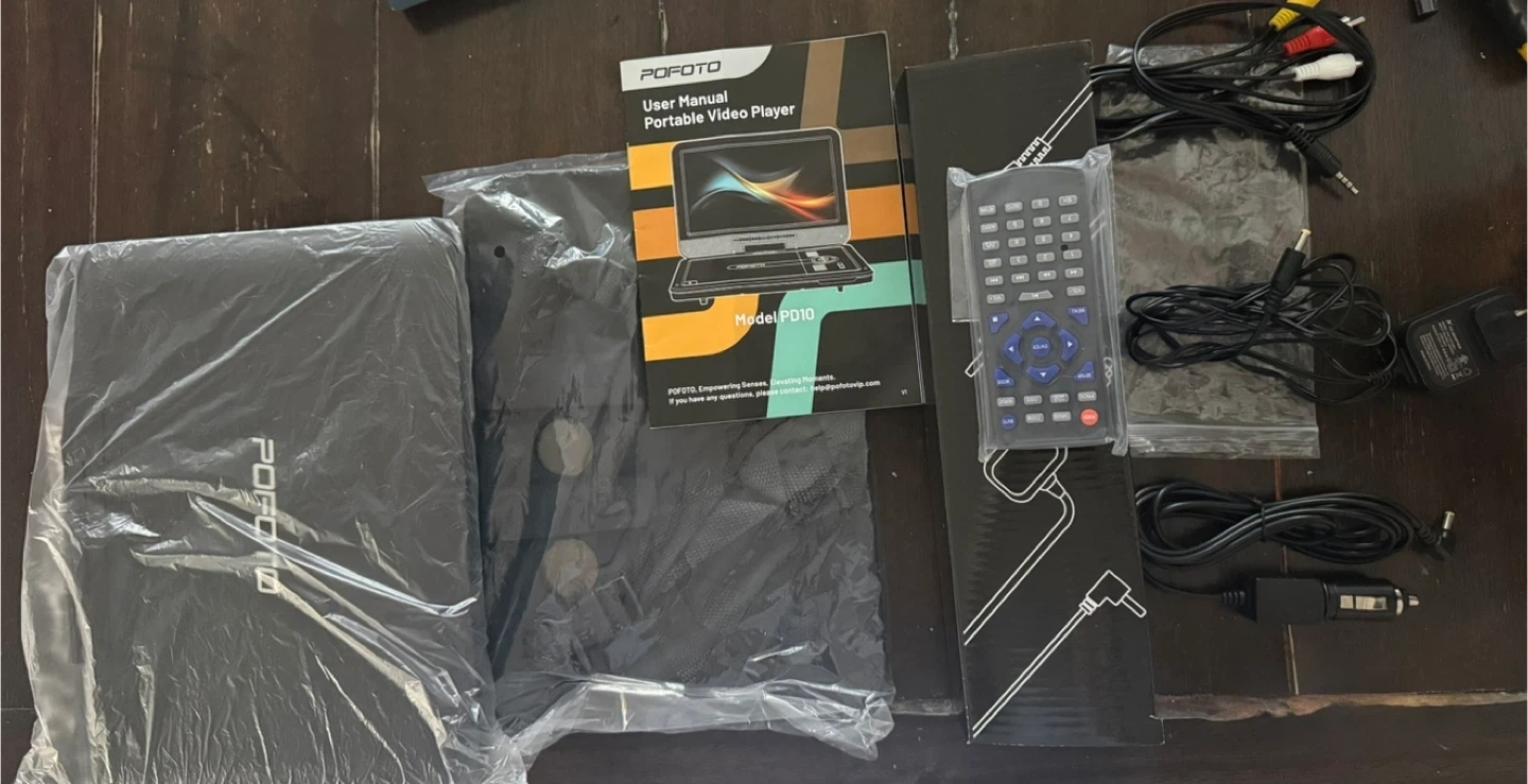 This POFOTO portable DVD player has a 12.5-inch HD swivel screen and a 6-hour battery life. It supports CD/DVD/USB/SD card playback. It includes a car headrest mount and remote control.