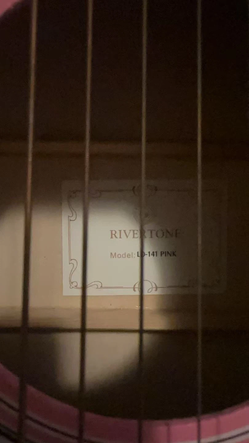 Pink Rivertone acoustic guitar, model LD-141. It's a 6-string instrument with a wooden fretboard and bridge. This guitar is great for beginners looking to learn!