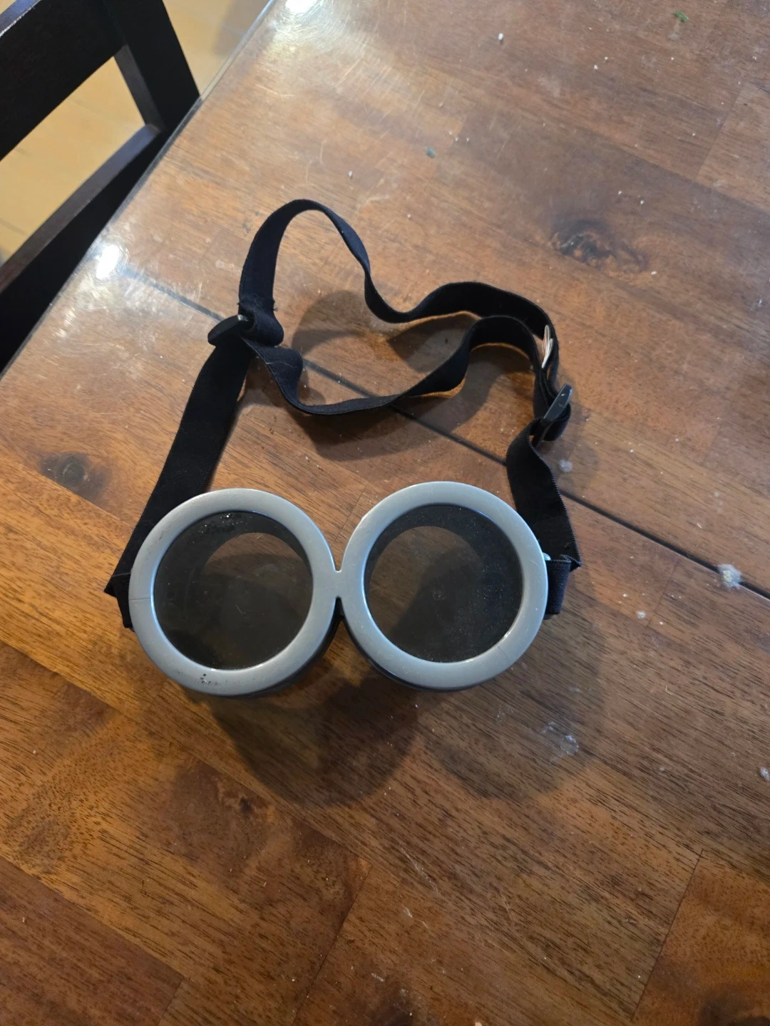 These are round goggles with a silver-coloured rim and dark lenses. They feature an adjustable black elastic strap for a secure fit. Great for costume or play!